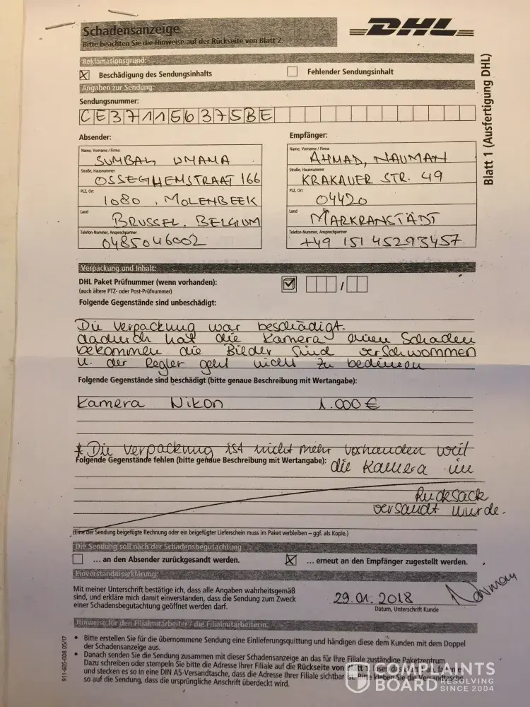 I have a received a package containing professional camera, lenses and lights in one bag that was not even properly packed in some hard box or anything. While at receipt of my package, the camera was broken that I complained about in Markranstädt DHL on 29.01.2018 but till today (02.03.2018) there's no response from DHL so far even after writing them two times on website and checking with their DHL office every week but no response from anyone at all.
