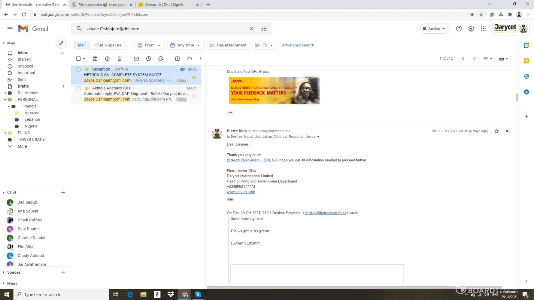 On the 19th I contacted by mail DHL office for the possibility to ship to Nigeria from South Africa parcel package 150x105x10cm weight of 0.5kg.