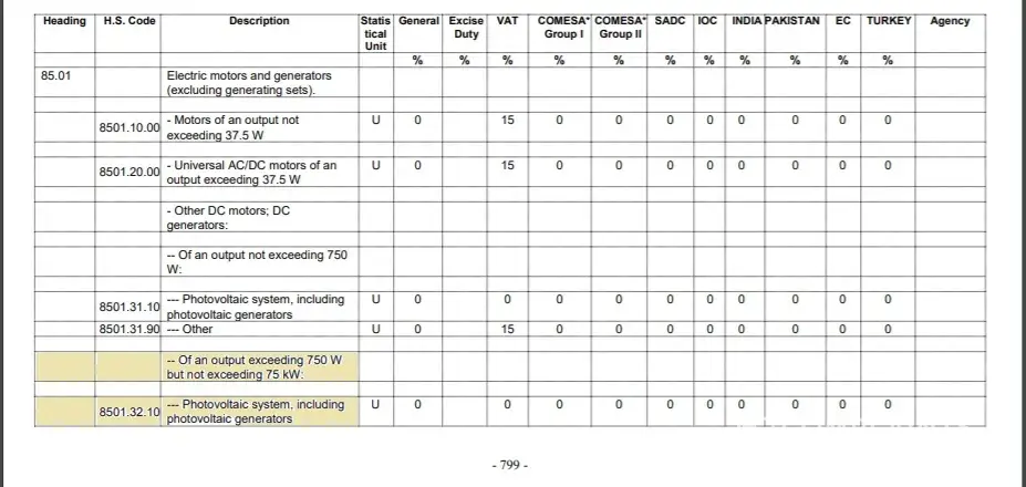 According to MRA Document REF: INT 03/14 and MRA Import tariff 8501.32.10 Photovoltaic system, including photovoltaic generators are fully exempted and zero-rated.