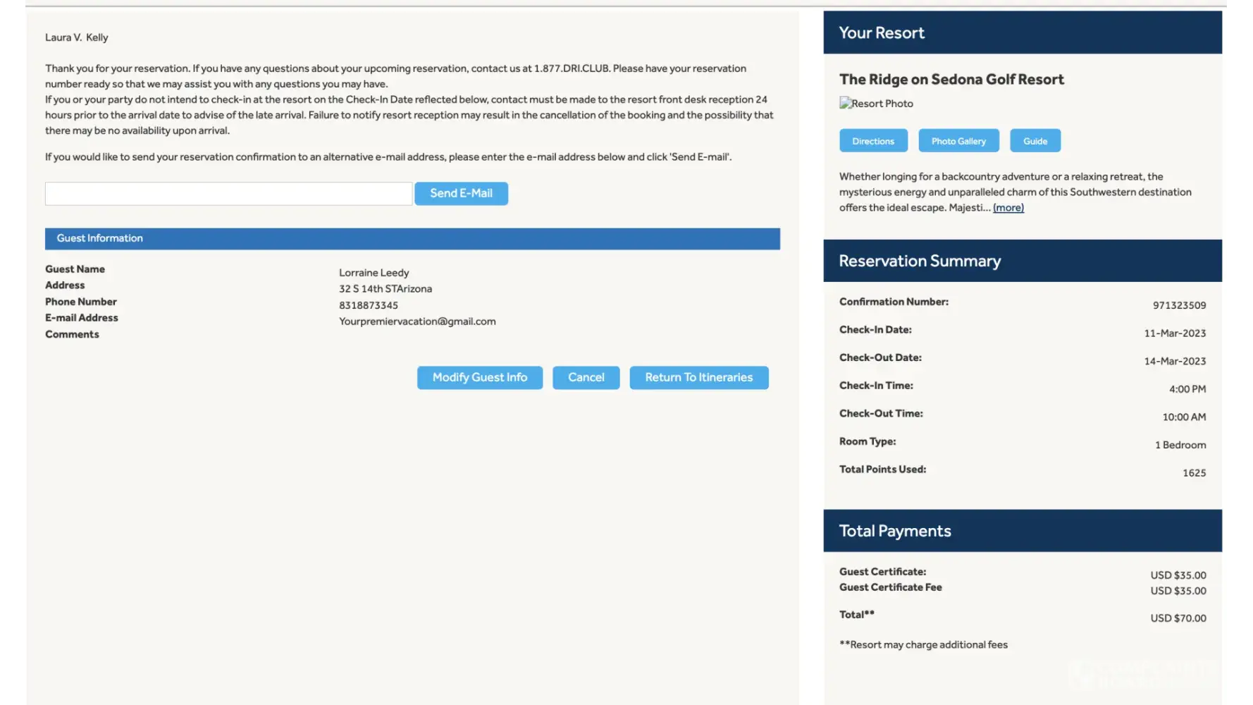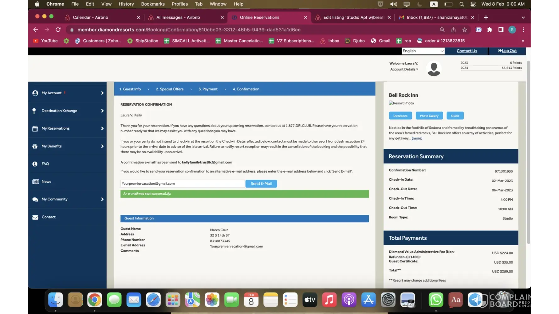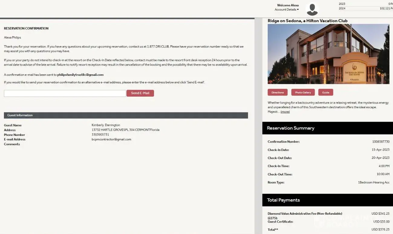 Desired outcome: I'd like my 11,500 points from Sedona Springs and my 2023 Diamond Points in my account now. I'd like an email, or text, to confirm it. I'll be reporting to BBB soon if it's not resolved.