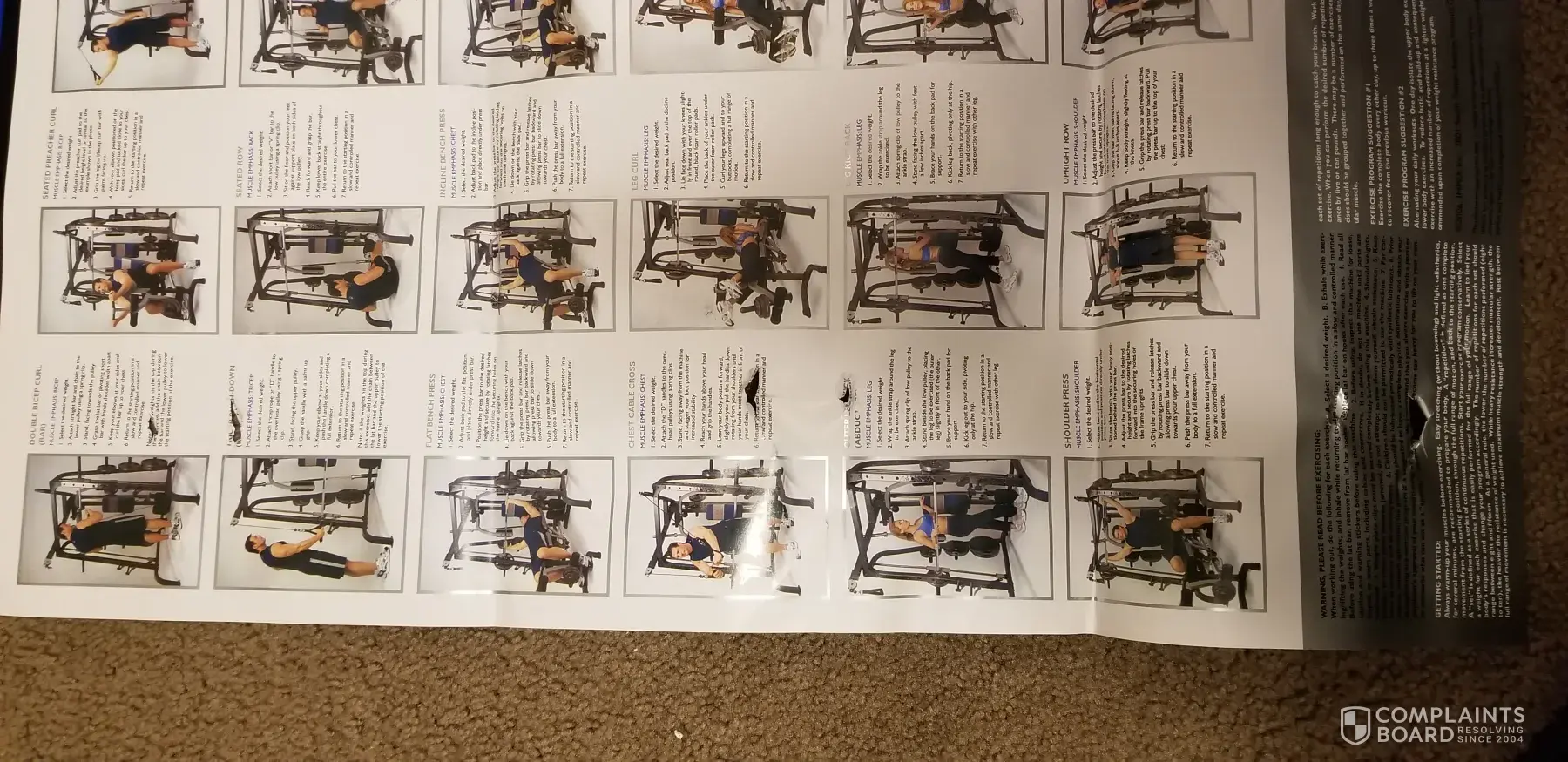 Ordered this product a week ago from DICK's. The product came with the boxes in some rough shape. A whole corner was missing from one of the heavy boxes, and parts were sliding out. Upon opening the product, within the time it took to unpack 3 main base supports the product was shown to be damaged beyond use as one was bent at a several degrees off-angle from where it should have been, with gouges taken out of the finish. Workout posters were slashed (somehow) beyond use for display. It looked like someone took a knife down the center of the shipping box.