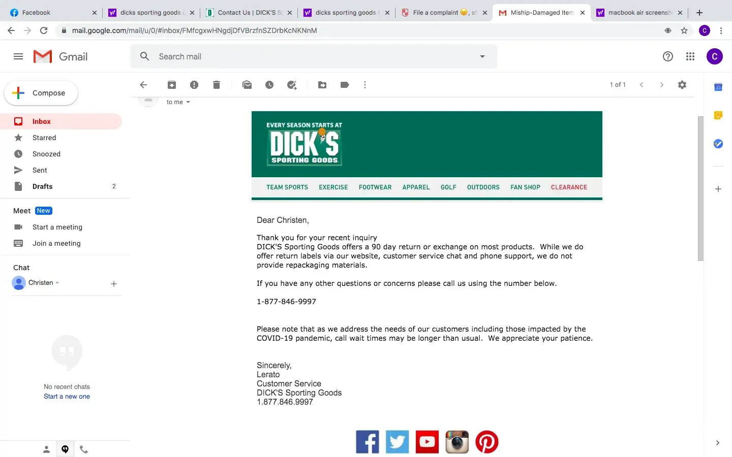 https://www.dickssportinggoods.com/s/return-policy This policy states that I am NOT eligible to return via a return label, but must return to the store, and I am out the $85 for shipping. Thus, what their representative stated by email was NOT what they were willing to honor.