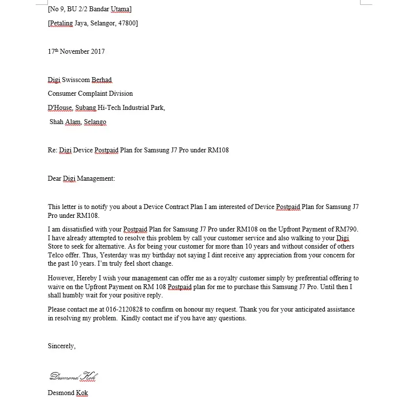 However, Hereby I wish your management can offer me as a royalty customer simply by preferential offering to waive on the Upfront Payment on RM 108 Postpaid plan for me to purchase this Samsung J7 Pro. Until then I shall humbly wait for your positive reply.