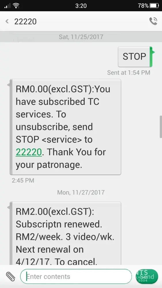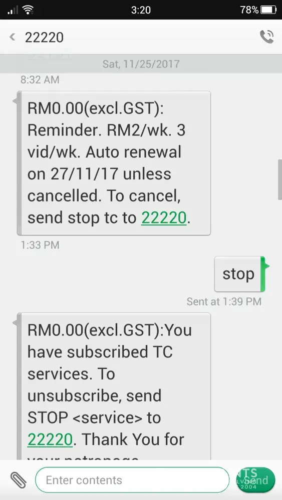 I received the renewal message every 3 to 4 days and it is really annoying. I even send "STOP" to unsubscribe due to ridiculous charge but no response.