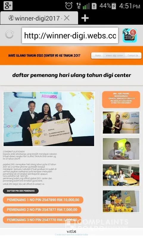 Announced me as a winner for Digi winner in lucky draw for 27th Digi birthday.he claimed that he was digi's worker for this banking money reward.he say I must have a credit card first so I made one at agrobank .then he say I must to bankin RM400 to bank rakyat so do it coz I believe that its was Digi and its safe .but then he say I must to bankin RM600 again and he will give me the reward from Digi.my number [protected]