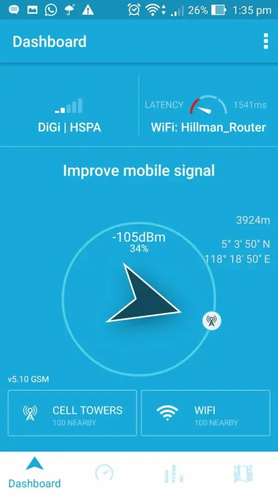 I experienced everyday weak signal in my house.. i seldom get 4g signal except when im at second floor which is also rarely. It turns out that when i check the cell tower using opensignal apps.. our area is far from any digi tower. Please add one tower at our area soon as possible because most of the recidences here also complaint on weak signal of any carrier including celcom, maxis etc. Im also thinking of terminating my digi plan and change to unifi if the problem still continues. I include in these attached files coordinate of my location and pictures taken from the screenshot of the opensignal app. For ur info i have been staying in this place since 2011 and the digi signal has always been weak