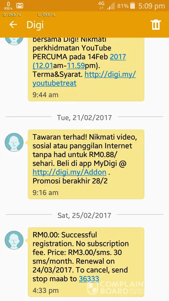1. I have been charged RM4 per sms almost daily via a third party. A complaint had been lodged at your Sunway service centre and I had received an sms verification with a case number stating that I will get feed back within 48 hours. It is now 7 days and still no feedback.