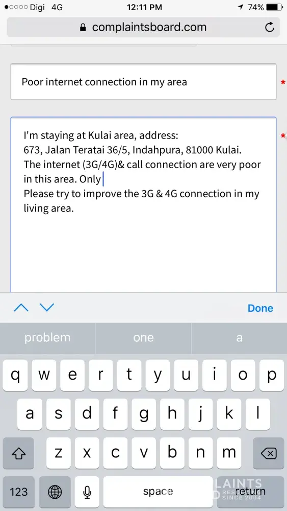 Assalamualaikum dan selamat pagi.. Disini saya ingin kemukakan kekurangan Digi Network di kawasan saya. Line yang tidak memuaskan dikawasan saya menyukarkan saya untuk membuat panggilan dan terima panggilan terutamanya jika berlaku kecemasan. Masalah ini sudah berlarutan selama 1 minggu. Saya sudah membuat laporan dengan Customer Service tetapi masih tiada dalam tindakan. Kawasan rumah saya ialah di Kampung Pasir Puteh, Merchang, 21610 Marang, Terengganu. Nombor telefon untuk rujukan ialah [protected] @ [protected]. Saya harap Digi dapat menyelesaikan masalah ini dengan secepat mungkin.