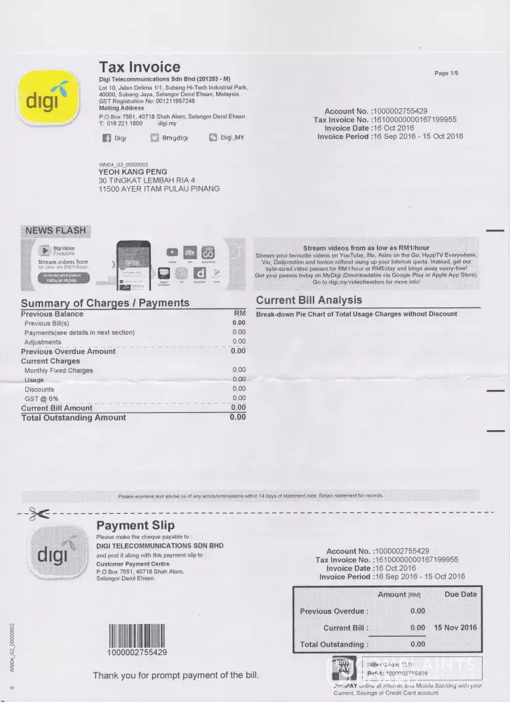 Saya seperti maklumat di atas ada menerima bil tunggakan digi postpaid sebanyak rm 900+ di alamat kediaman saya c1-11 apartment impian indah, 47000 sungai buloh, selangor darul ehsan.