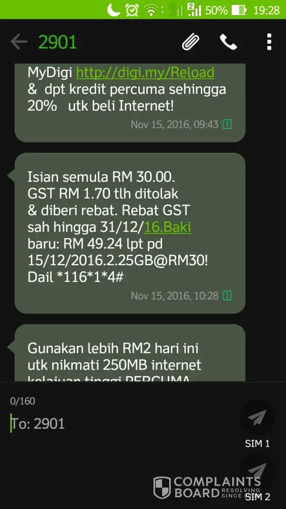 2nd Issue: On 17/11/2016 midnight 3.33am, i been charged RM1 for 50MB data for 1 hour which I never request for.