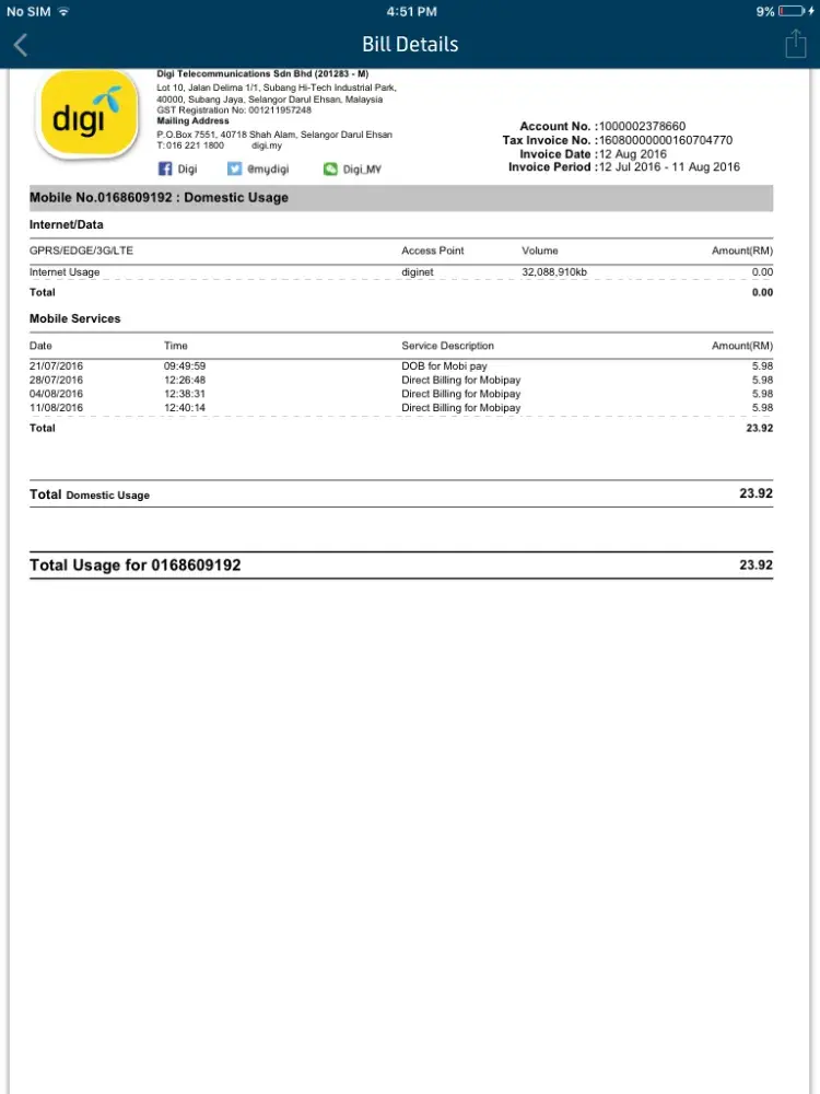 I recently went to Medan, and I called up the DIGI hotline, wanting to know if my roaming was activated, and how much was the charges if I switched on my 3G. I was advised that if I selected Indosat network, its only RM38 a day. I called up twice after that to ensure the information I received was correct, and since I received consistent information, I was glad. Upon reaching Medan, I was asked to select a network- there was a popup on my iPhone screen, and I specifically selected Indosat. My stay in Medan was for 4 days and 3 nights and upon returning to Malaysia I decided to check what is my outstanding to make payment.