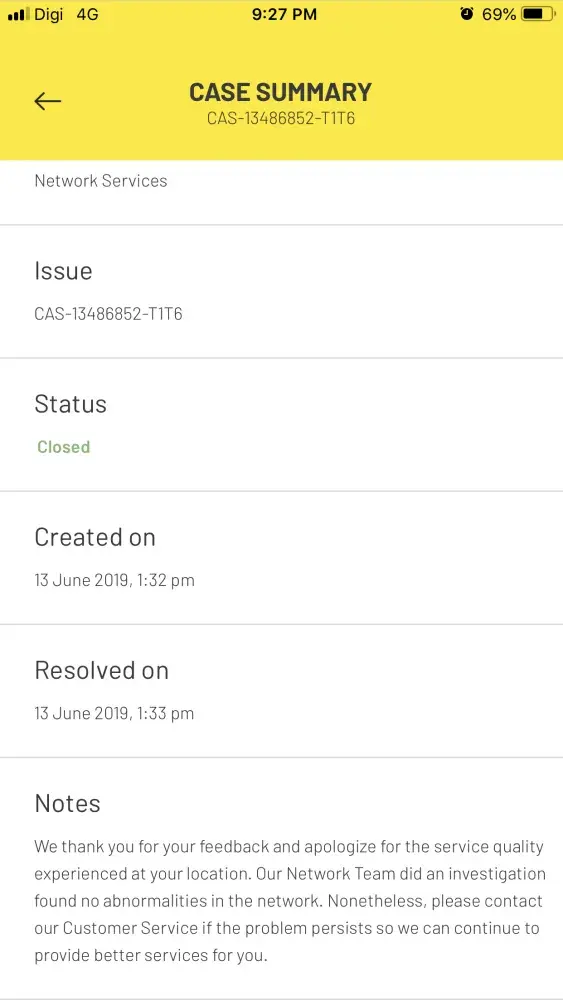I've reported a complaint on behalf of my company early this year regards on receiving internet coverage issues in our office area as we have purchase Digi as our tel co communication for working purpose. Yet until this date 8 July 2019, there's yet to find any suitable solution on this matter and I've been following up on this matter for almost HALF A YEAR.