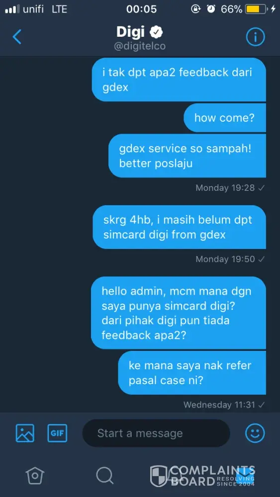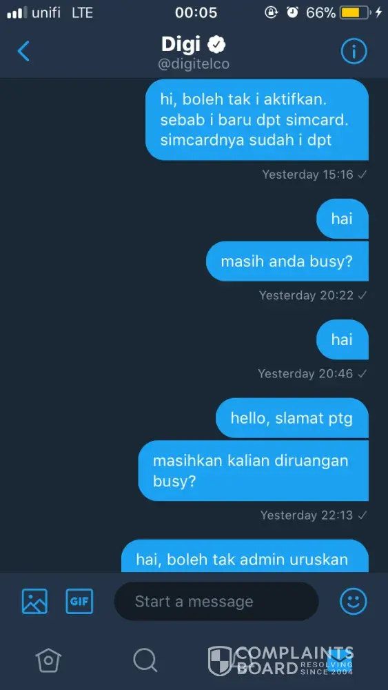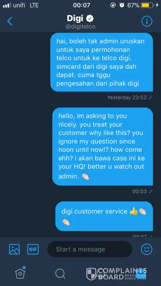 I nak buat satu pesanan complaint, and I nak you all take it serious this issue! Im not satisfied with your digi customer service from account twitter digi. And I call customer service many many and many times until now not in respond. Nobody admin answers my call. Dari twitter, I tweet banyak kali for the switch telco and I need permohonan pengesahan untuk ke digitelco. Them ignoring me since noon until now. I check digitelco timeline going online. How come your perfect worker can treat thier customer like this? What a shame. Come on! Ini kali pertama I jumpa customer service really suck and pathetic. I want hq tale the action tentang issue ini. I akan bawa issue ini ke pihak atasan. Watch out you guys! ðŸ‘ðŸ»ðŸ‘🻠+[protected] (ariff)