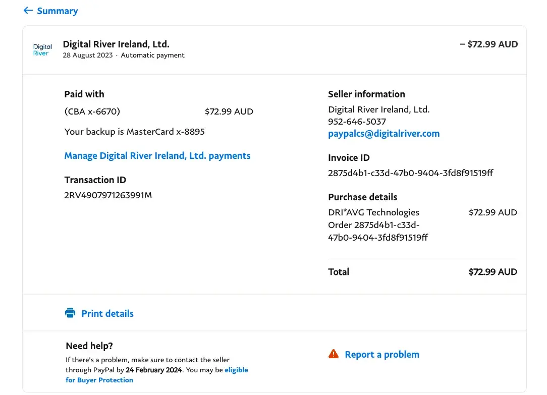 I have had 2 bills form internet security with digital river on 20th dec 22 by automatic payment price £53 -99 transaction id 4gj12591yb162702f invoice id 8716350b-c13c-49d9-9462-11ff7af904e8. Digital river ireland ltd then charged me another £53 -99 on 8th nov 22 for the same thing transaction id7ub37719dj8420208, invoice id 8ec77485-f83c-43f3-b529-6c6c9afc 2009. Purchase details dri*avg technologies please can you help to get a refund on the second purchase. Kind regards irene osmond
