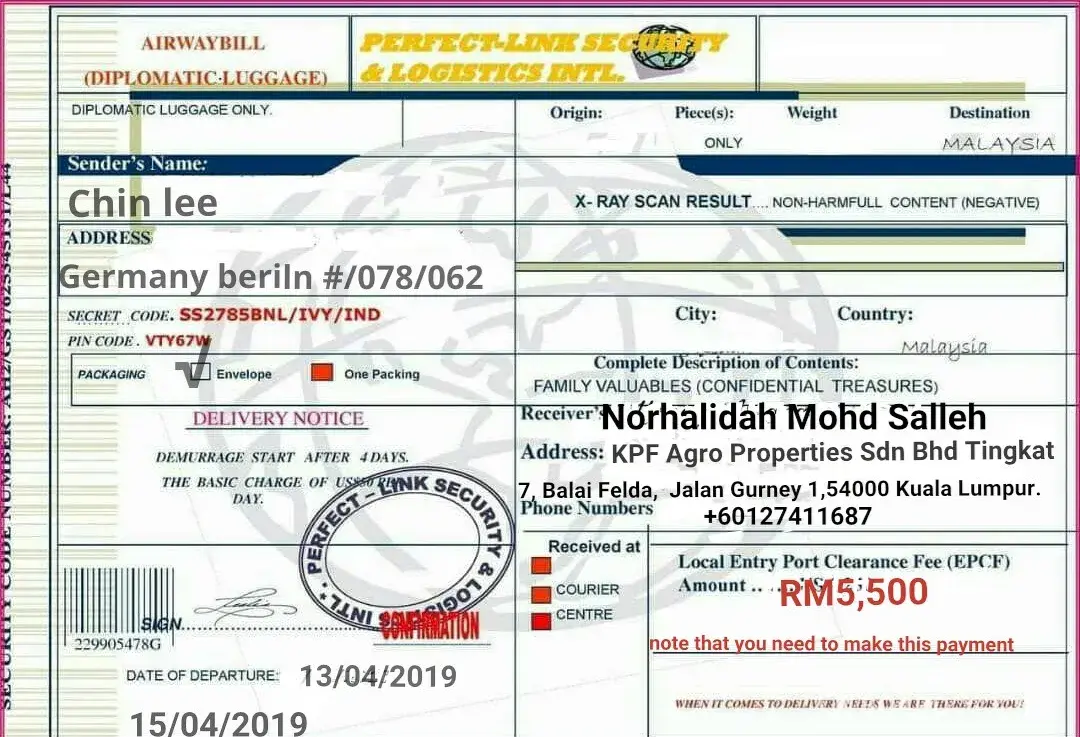 My boyfriend from USA gift (parcel) iphone & money for me but I have to pay RM750 After I made a payment they sent parcel..but I did not pay.The company will deliver these items within some days . I have already paid for the international delivery charge. But i was told that there will be a local charge down there in Asia for the protection of the luggage and safe delivery because I registered it as a special luggage. So, comply with them so that they can deliver immediately. In case they ask you about the content, don't let them know that there is money inside the enclosure. they will also contact you directly. So, i would want you to keep it a secret. Don’t tell anyone .