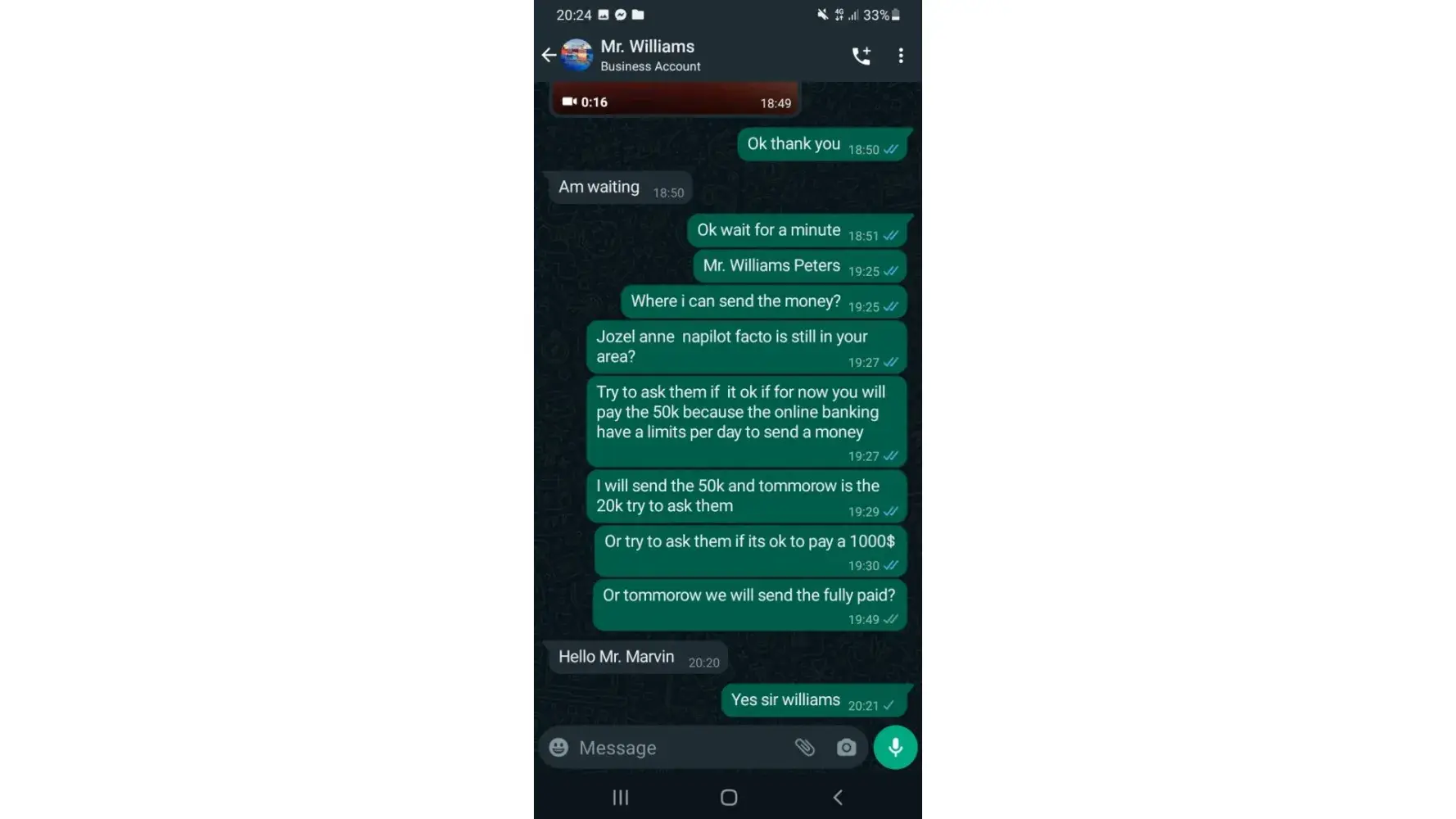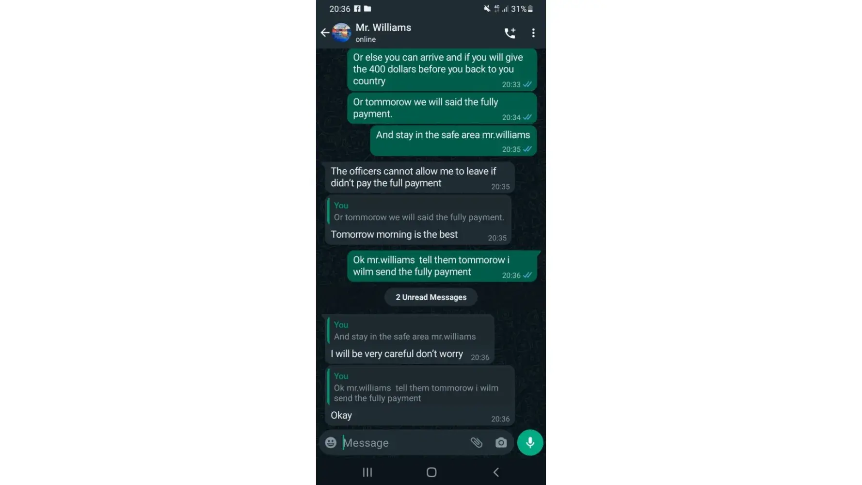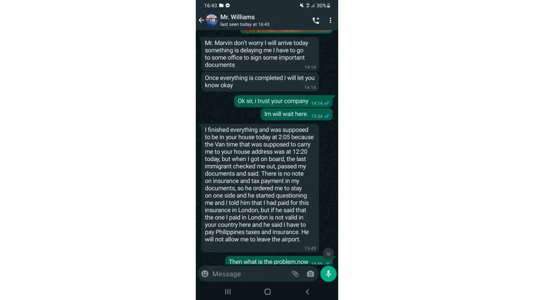 I just pay the money.after he say now give other money RM-5000.00, but I do'nt give the money.my girlfriend say you pay the money and recive the persel. but I do't have money. I say my girlfriend if you can pay money do it.she say now she stay scotland.so she no give money.I just call agent ok you return to persel london.