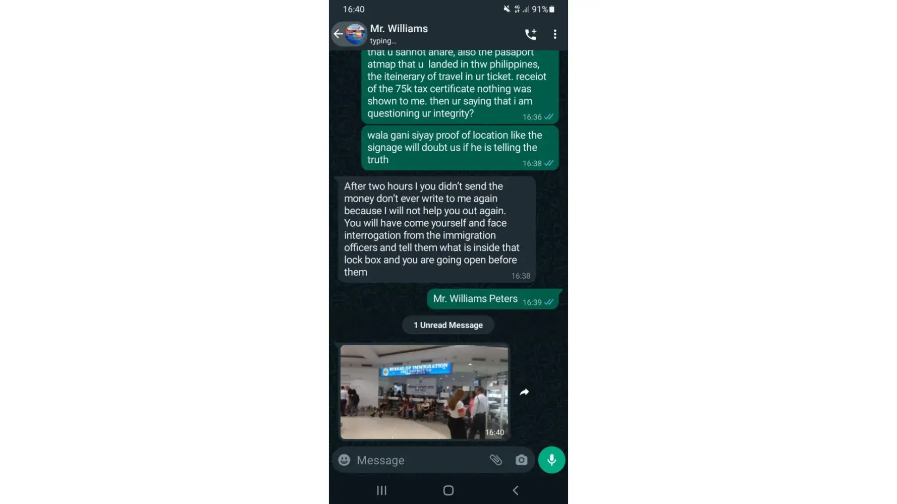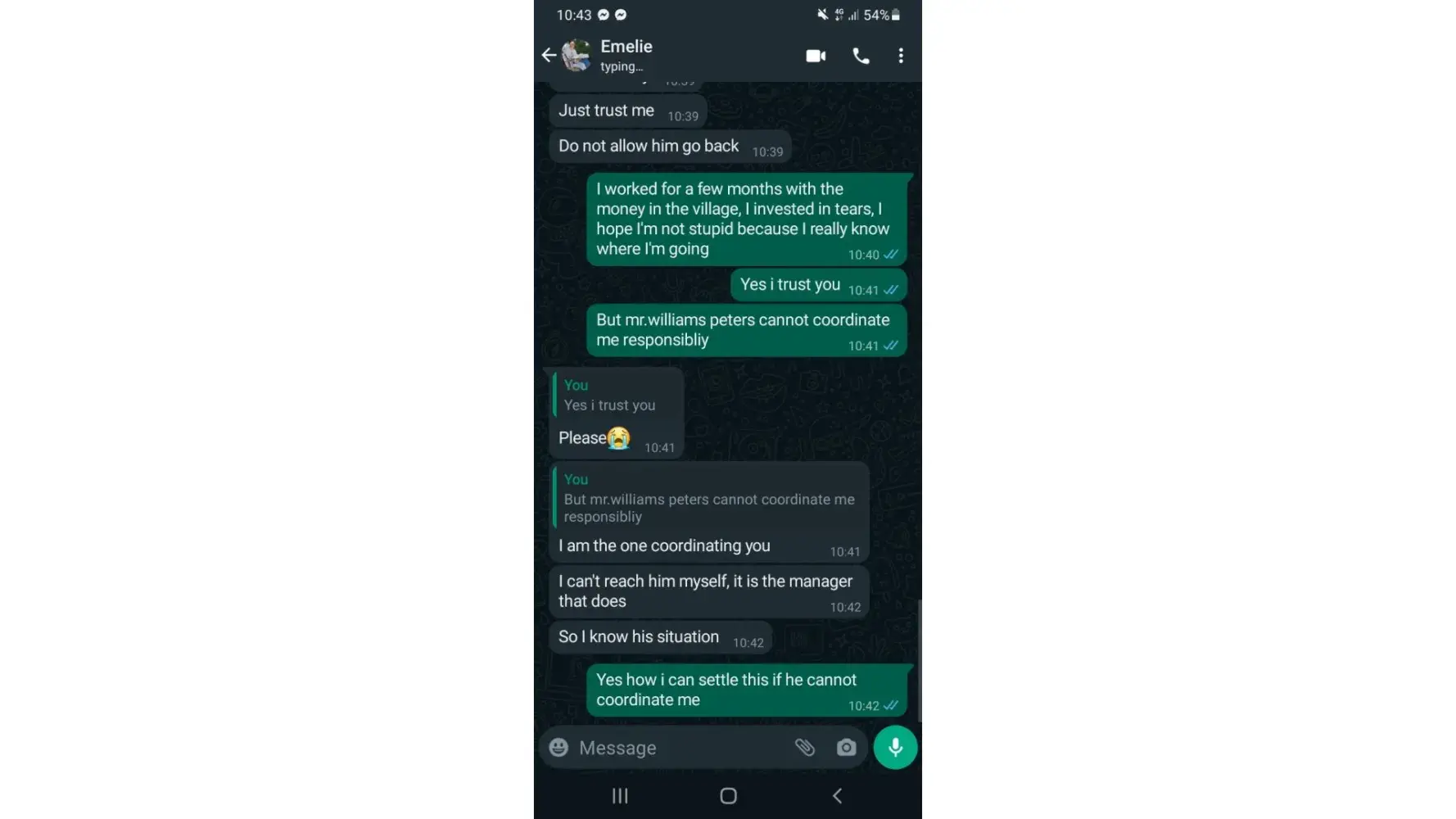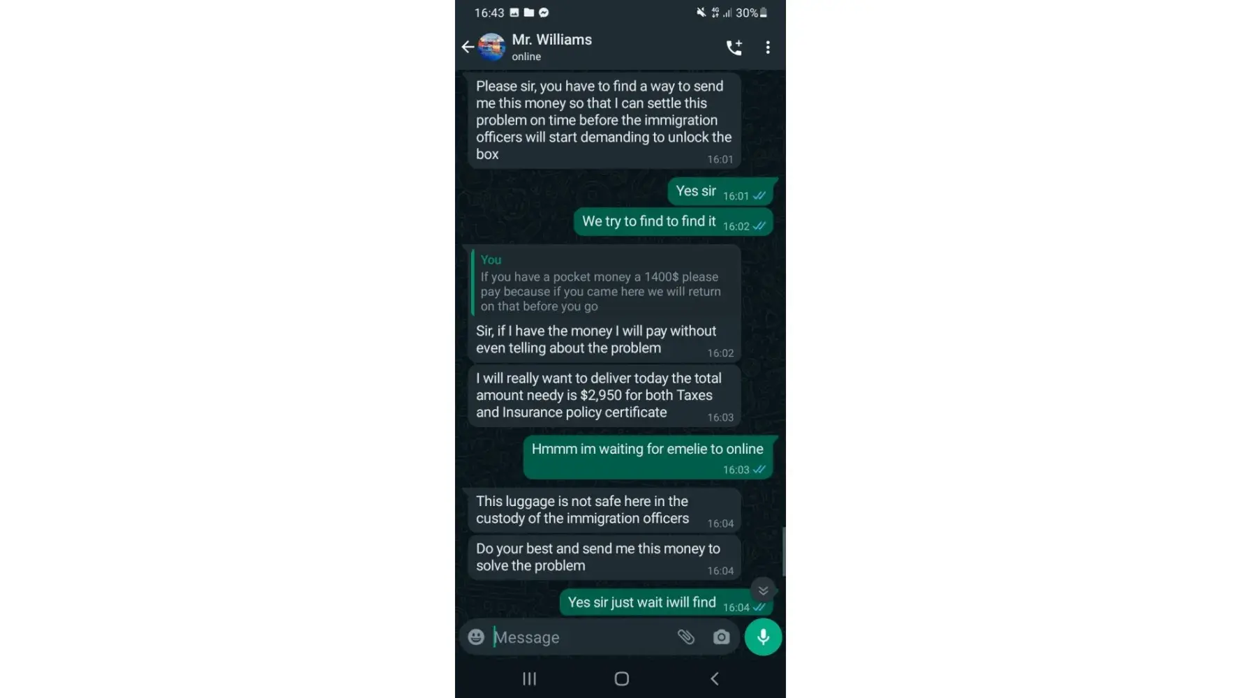 THIS IS THE ONE PERSON WHO SCAM MY MONEY I LOST 1550$ because i need to pay for the taxes to recieve the luggage after he recieve after 6 hours he said i need to pay additional for the insurance that is the reason, thats make me to think. Mr.Williams Peters is the delivery man and the sender is EMELIE ASADEL i have a lot of evidence here.