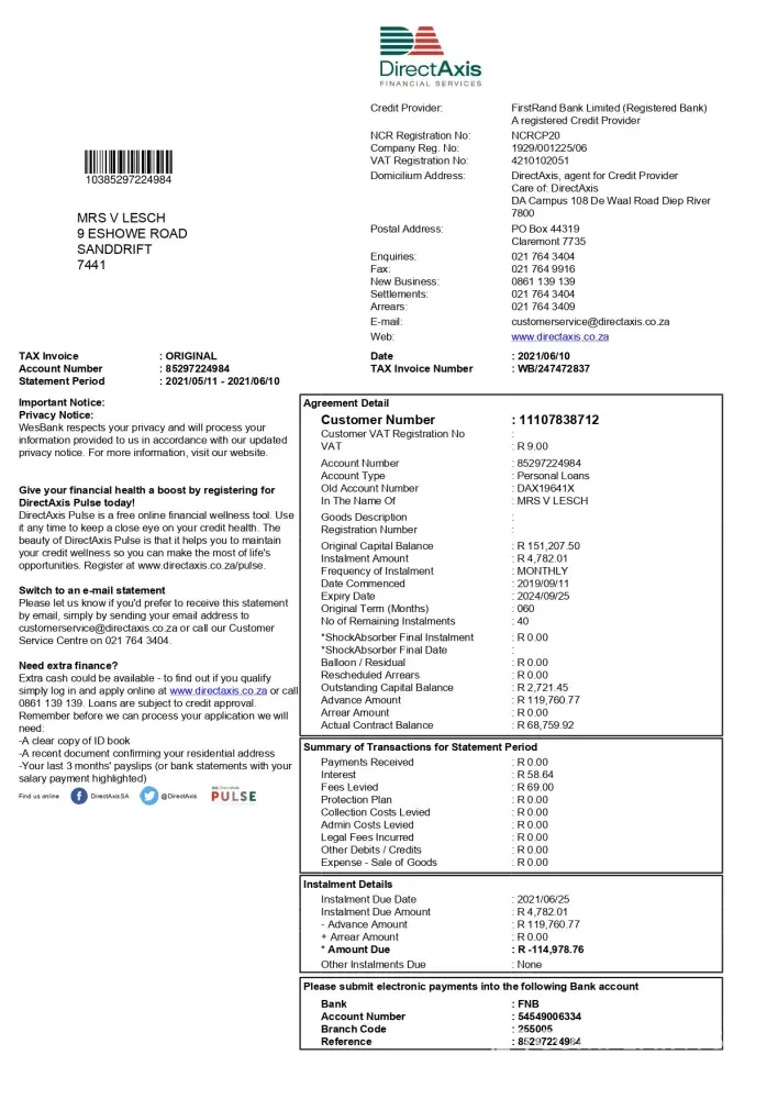 I try for the last 4 months to contact them by phone or e-mail. e-mails don't get answered or been deleted without open the e-mails. try to phone lot of numbers one person direct you to another and another on the end you back at the main meneu. I need a statement last statement received was November 2020. I had a covid releave and the put on my account on 18 May 2020 R13484-00 admin fee, after extended the loan with 3 months nobody can explain that to me. I got a letter that my first payment after the covid releave is deu 25 August 2020 then they try to deduct on 25 July 2020 as there was no funds because of the letter indicated that first payment is deu 25 August 2020. now they claim I'm one month in arrears and put it on my credit score as one month in arrears. hope this letter can soft this problem now. hope to get this problem solft and feed back and not just get promisses. I start to loose faith in Direct Axis ID [protected] Mr Christiaan van Rooyen