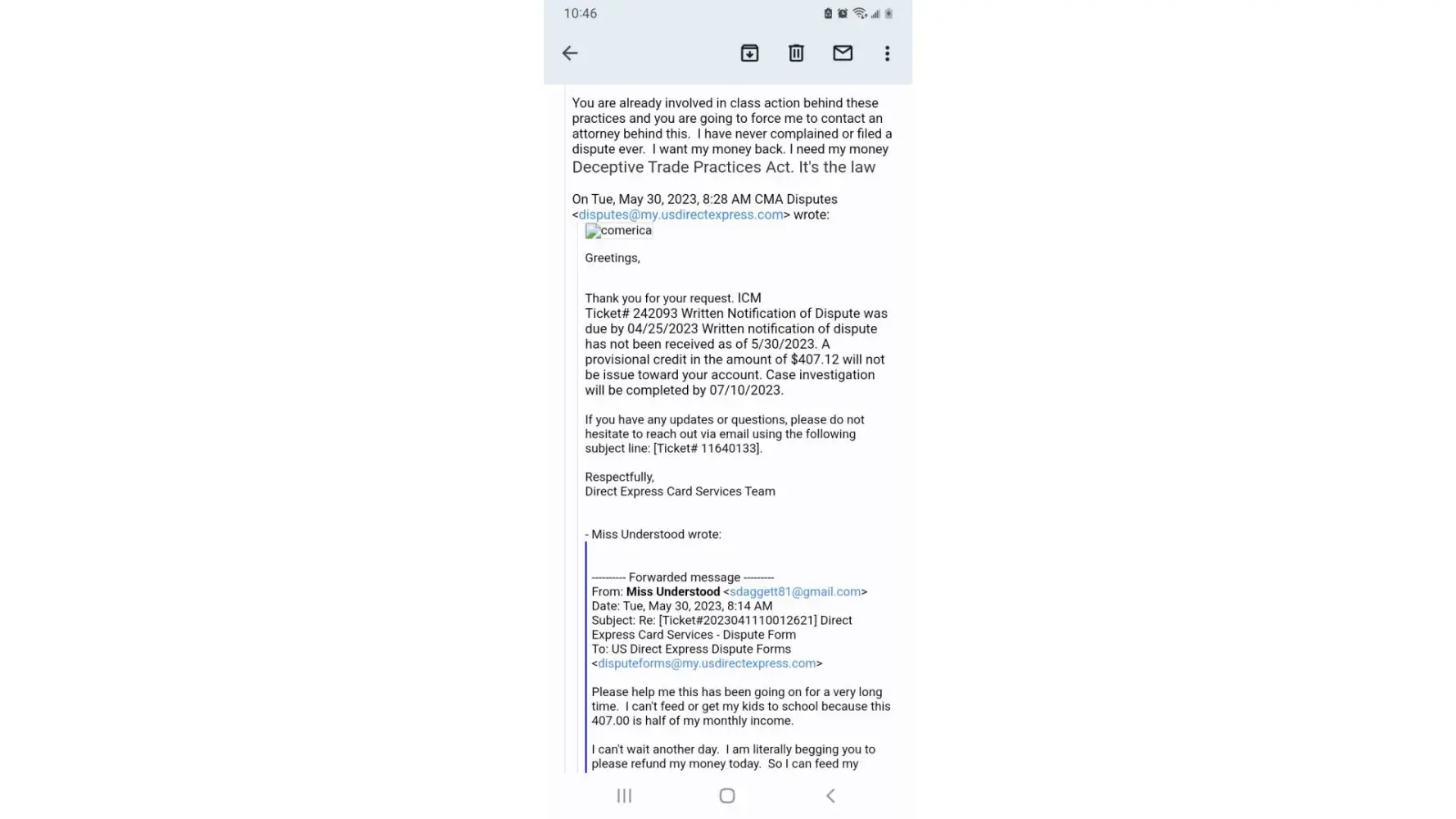 In March 2023 there was a 407.12 charge from Verizon wireless. I never owned a Verizon so I sent in a dispute, they sent Me back a form, I filed it out and sent it back the next day. The dispute dept confirmed they received. I was supposed to be refunded in 10 days it's now May 30th and they say it will be until July 10th before I get a response. 400 is 40% of my ssi. I have children and can't feed them because of this. They have no care or compassion. I've been hung up on by supervisors and csr. I've begged cried they don't care. I am sitting home without even water to give my kids. Can't even drive to a food pantry because I don't have gas. I've never cooked a dispute the entire 5 years I've been with them, they will not speed the process up. I've called Verizon and they have no recorded of My ssn so it shouldn't be this hard for direct express. I need my money today. I see they have lawsuits but I can't get anyone to help me