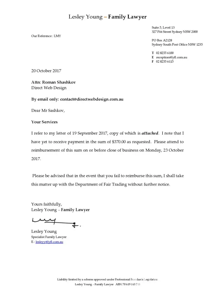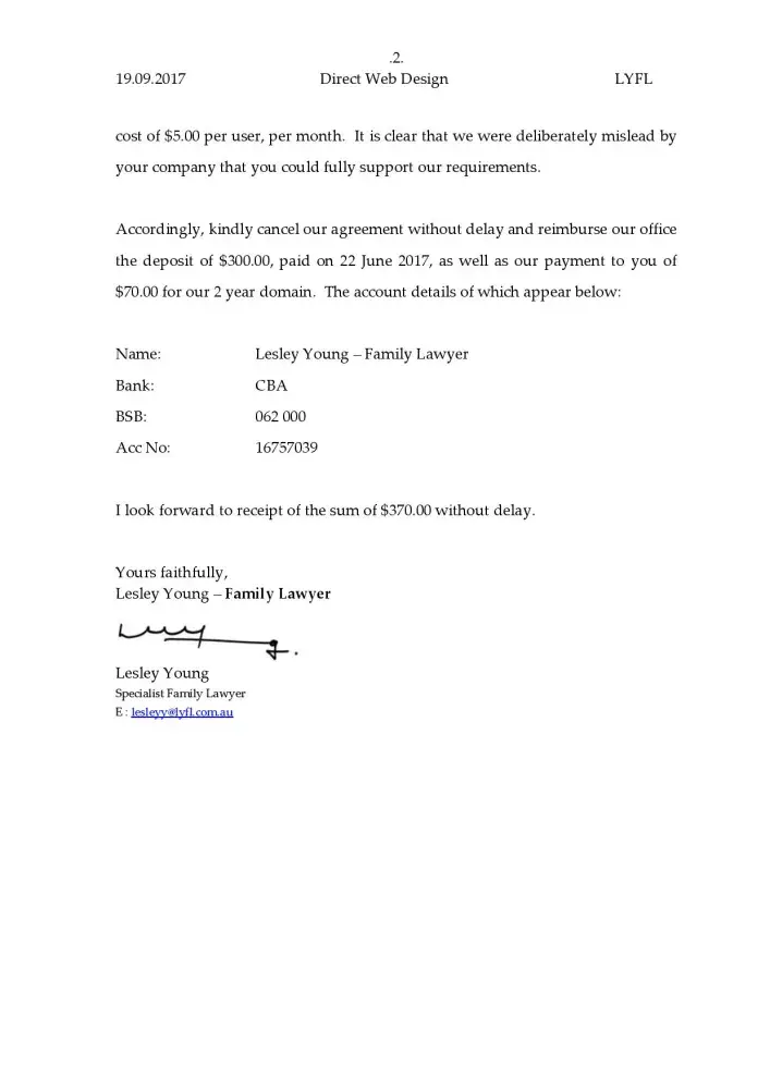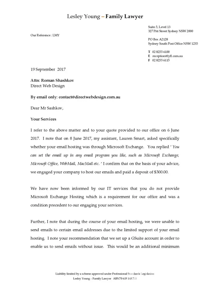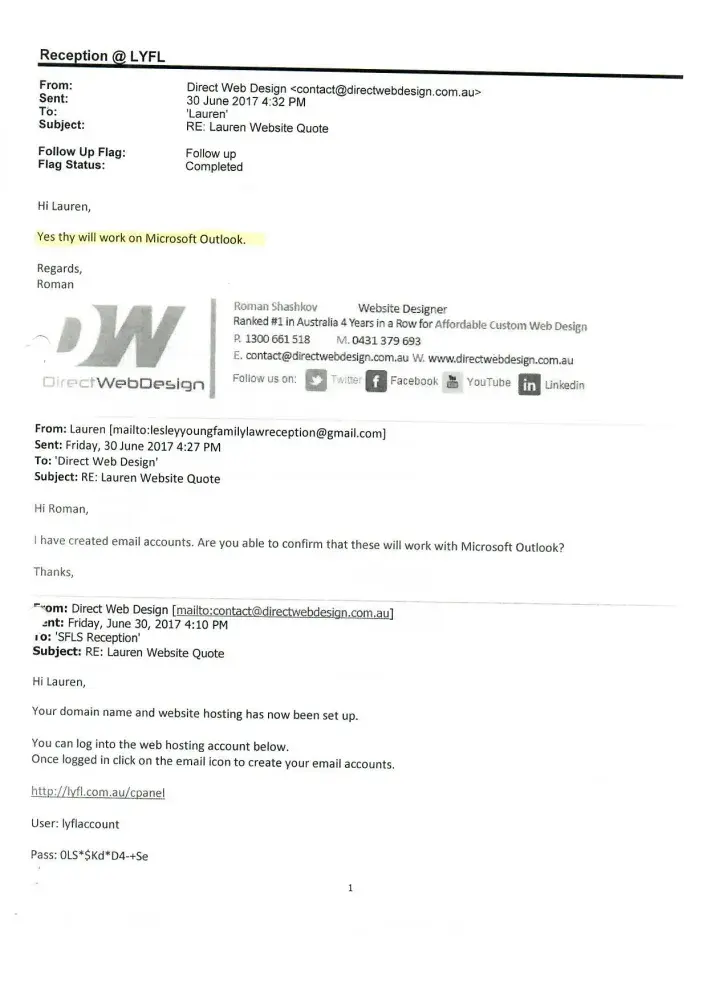 On Tuesday 6 June 2017, I, Lauren Smart, employee of Stacks Family Law, received a quote from Direct Web Design in response to my request regarding website design for our family law practice. Part of the package as advertised included setting up email accounts.