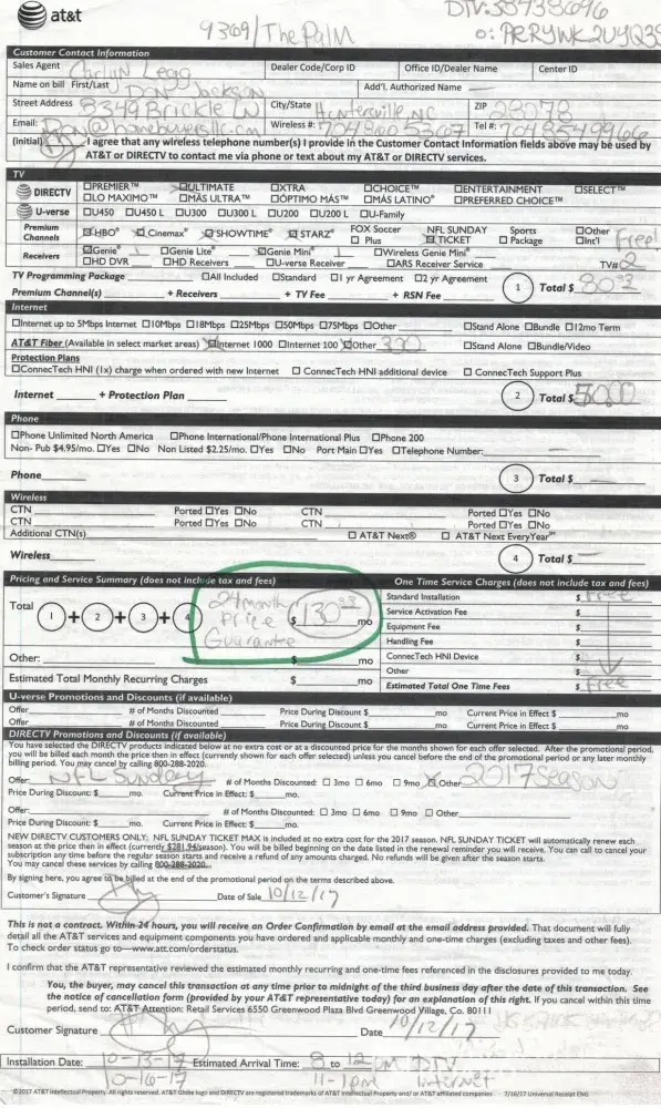 On 10-12-17 a Direct TV rep knocked on my door and sold me on a 24 month plan which included all the premium channels for $130/mo. It states clearly on my contract the terms, yet 4 months later my bill goes up to $200/mo. And no one will look at my contract. So, After fighting this for over a year, I thought I would try to get Direct TV to cooperate and honor there agreement, or pay me for my pain and time dealing with this situation.