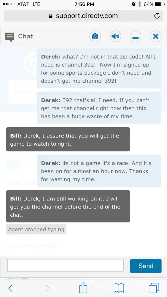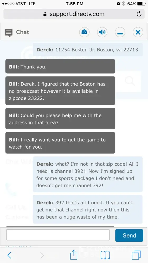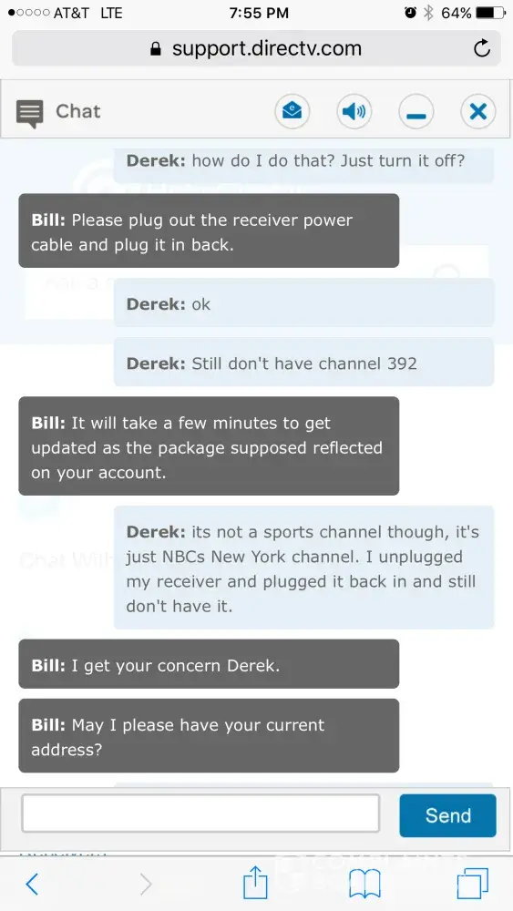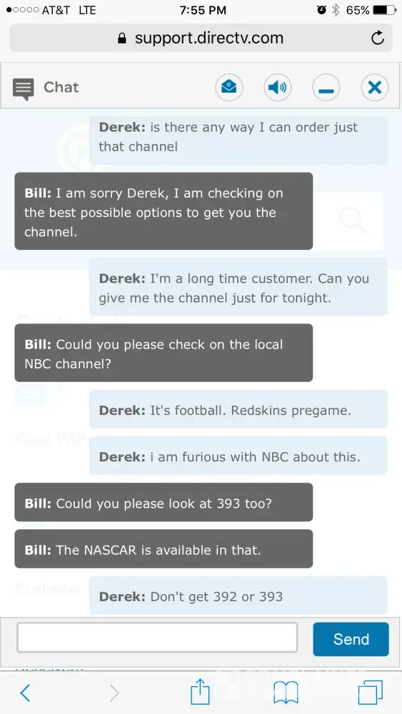 For the first time ever the NASCAR race was on a channel I do not get. Used the chat feature and was on chat for over an hour and they could not help or get me the channel. I then called in and kept getting transferred over and over to different agents who would ask the same questions and never help me out. I was eventually transferred to billing for some reason and finally got fed up and hung up after at this time a 2.5 hour saga. All I wanted was one channel!