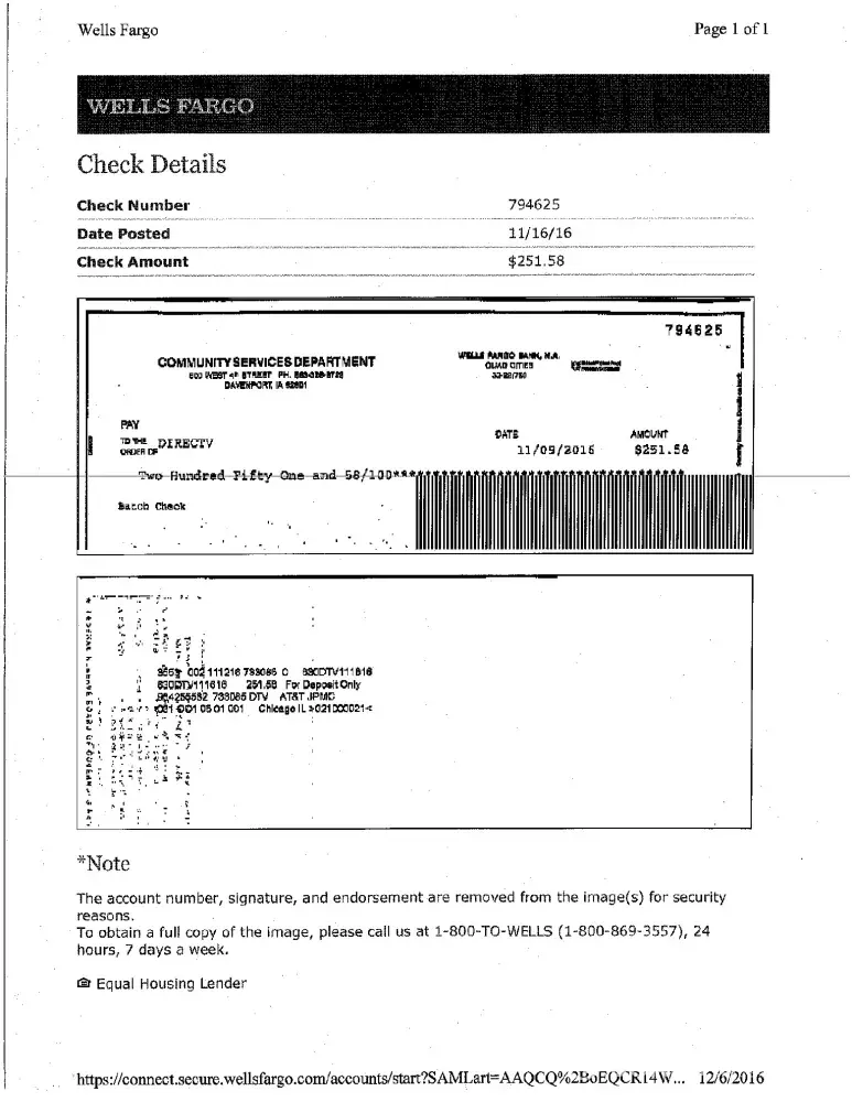 On 7-17-16 a check was mailed to direct tv in the amount of 63.30. # 5122. The bank deducted this amount from my account. Direct tv posted it as