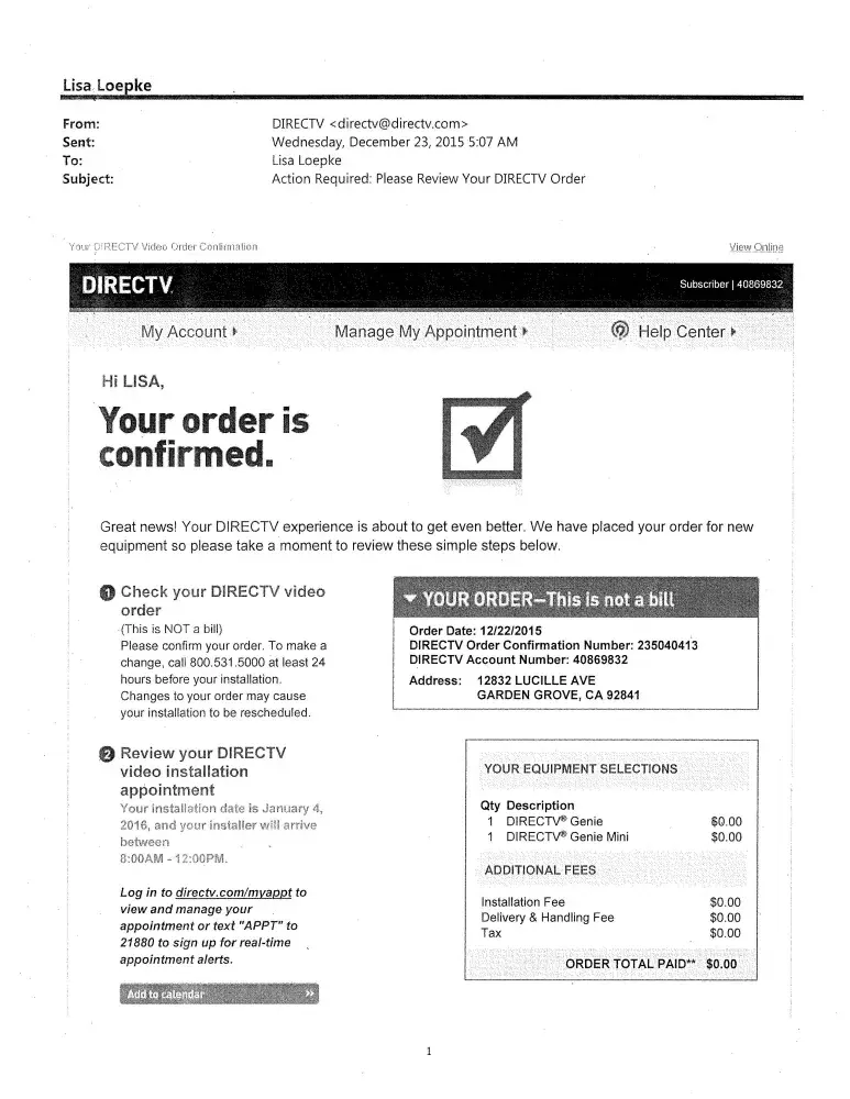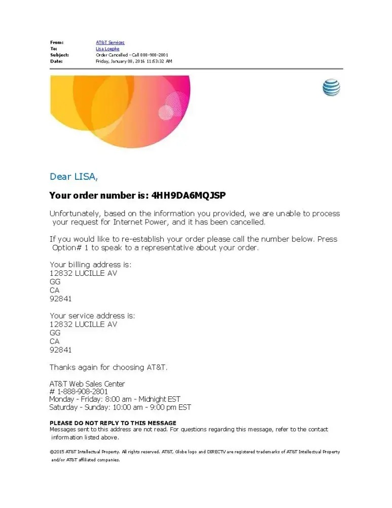 On 1/8/16 att and dtv confirmed my entire bundle order was cancelled and I would not be charged for any of it.