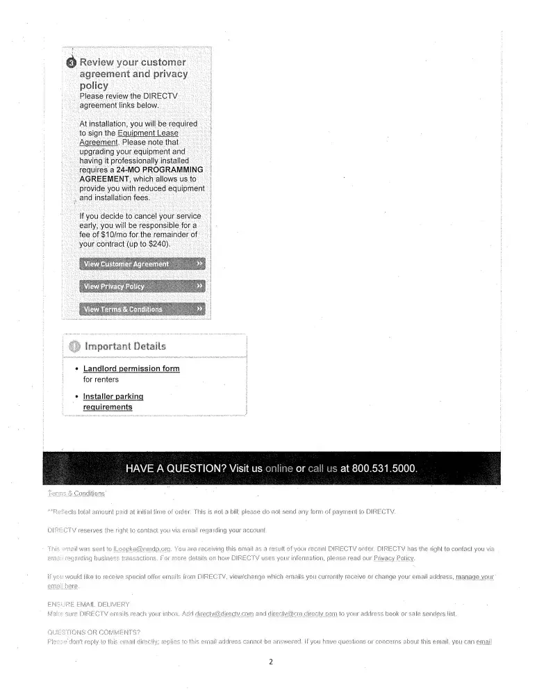 I terminated my agreement with directv for to service in mid dec. 2015, because their equipment didn't get good reception where I live. After verifying that with a directv workman, I was told I would not be charged for cancelling before my contract was up, since they couldn't render service. I sent back my equipment in the boxes they provided in a timely manner, and paid up all bills. On jan. 15, 2016, I noticed a bill from directv in my email box and opened it to find a bill for $296.80. There was no itemization of what this bill is for, and apparently if it isn't paid, my credit card that I used to pay for their services in the past will be charged this outrageous amount. This is way beyond any monthly fee I ever paid to directv, and they have my equipment, so what do I do to stop them from charging me money I don't owe? My account number is/was 5008787
