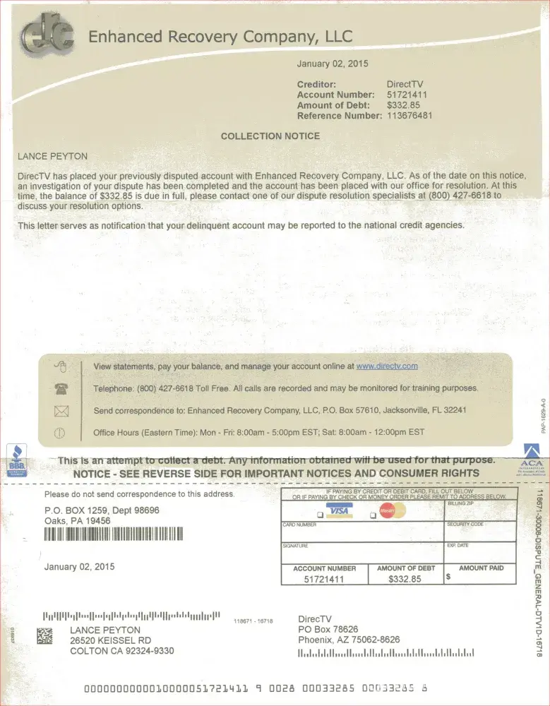direct TV never worked could not understand the person that did installation did not explain anything Never worked right I called told them I had to watch one station. I SENT back everything, they took there equipment off my roof I am 69 I think they are harassing me to get me to pay for a product that did not work This whole mess has me upset I tried to tell them they don't listen What can I do? I need help I don't have money if any can tell me help me I would be so happy I went for senior housing this showed on my credit report I need help This was at least 2 years ago or more