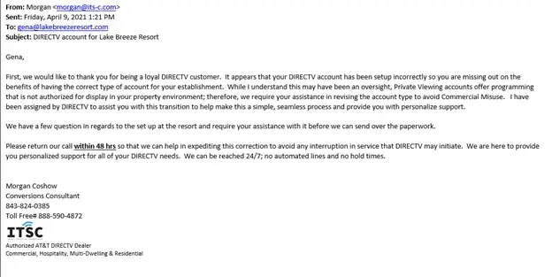 Yesterday our business account for DirecTV, Lake Breeze Resort, was deactivated. All bills have been paid on time for the last 12 years. When I called they told me I did not have an account any longer. I needed to call a 800 number. When I called new 800 number (its-c dealer) they told me that I received an email from its-c (see attached) saying I had 24-48 hours to correct the account type for my establishment. I received it 4/9, 2 days prior, and thought it was spam (see attached). I never received any notification or contact via email, letter, call from DirecTV. Not only was this surprising but now all my lodgers do not have TV. This felt like a scam. ITS-C, Tammie, said she can reactivate my account if I agree to pay $1800 + $240 for new receivers and split my bill into 3 accounts which would more than double my monthly and also sign a 5 page contract. My only other option was to leave TV down to all my units. If my account was misconfigured, it has been so for 12 years and it would have been done directly by DirecTV people who were the folks that came onsight and configured each unit. I would have been happy to work through any issue with proper notification and some additional time. But, at this point, I am told I have to decide now to get my TVs turned back on. ITC-S's president, Tammie, says this was not her doing that it was DirecTV, but I could not get a contact name at DirecTV from her (just an 800#). My TVs are basically being held hostage and I am being forced to pay and sign if I want to return to normal. We tried calling DirecTV again and they only told us they would escalate our complaint and get back to us, but that we were being considered fraudulent. (What?)
