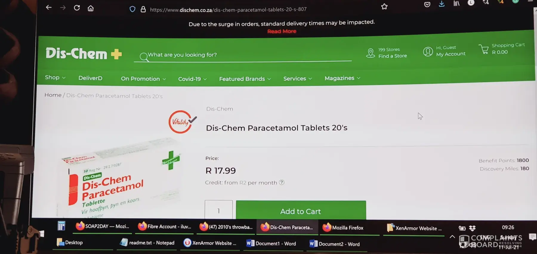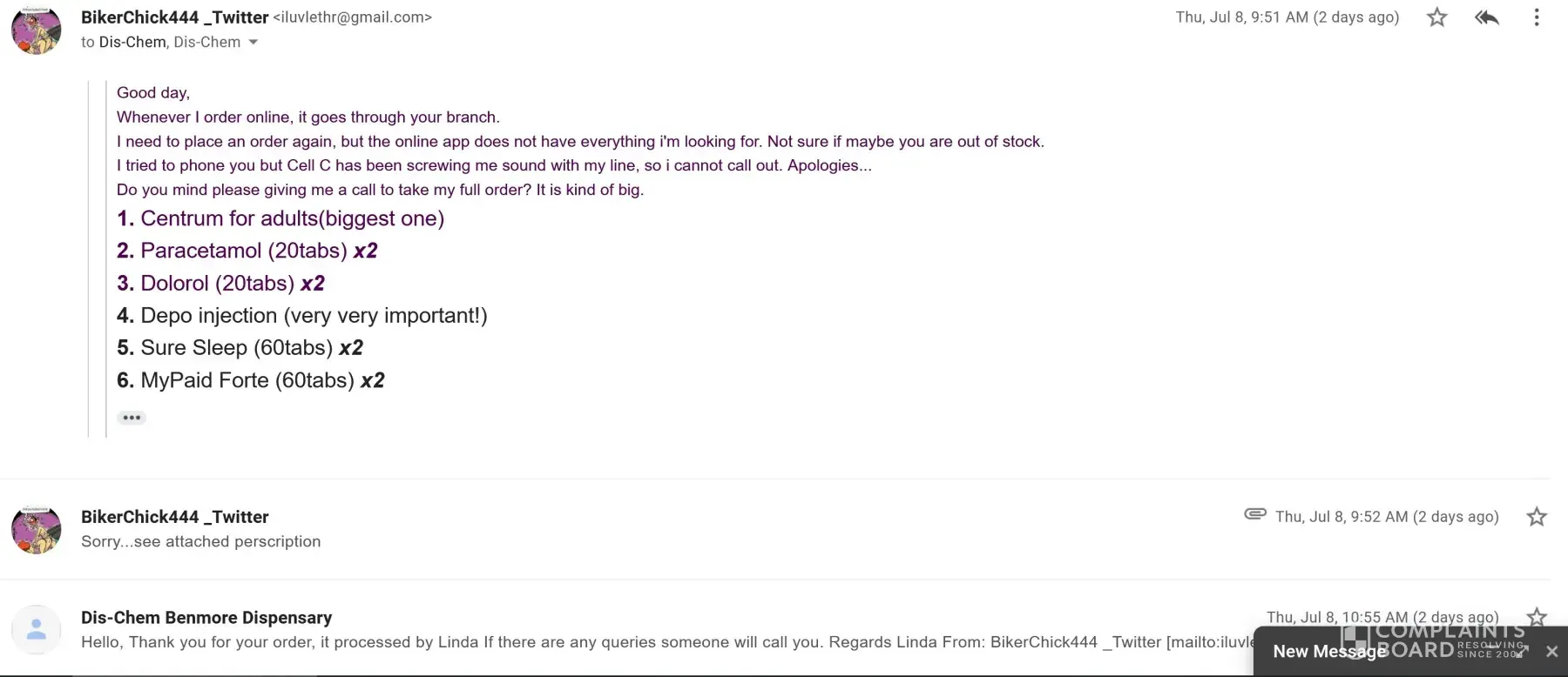 I emailed a big order through to Benmore Gardens DisChem, 3 days ago (7th Jul 2021). They didn't deliver the day before yesterday, so I emailed them asking why my order wasn't delivered. The lady (Linda) replied, stated that they had too many COVID cases and couldn't deliver (i have email proof).