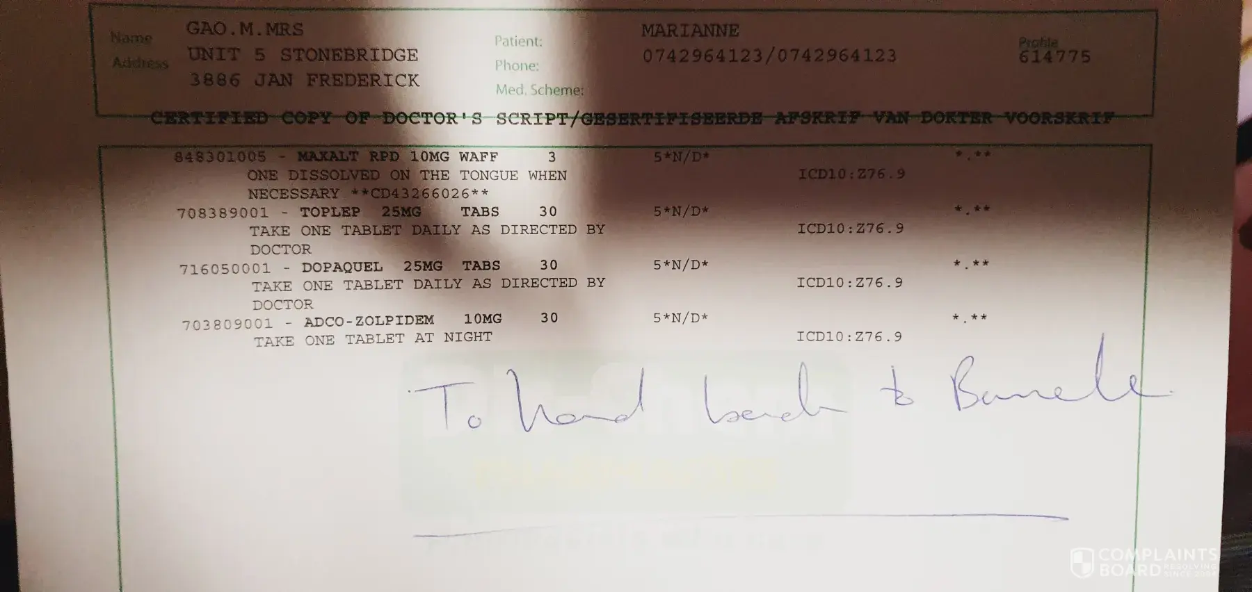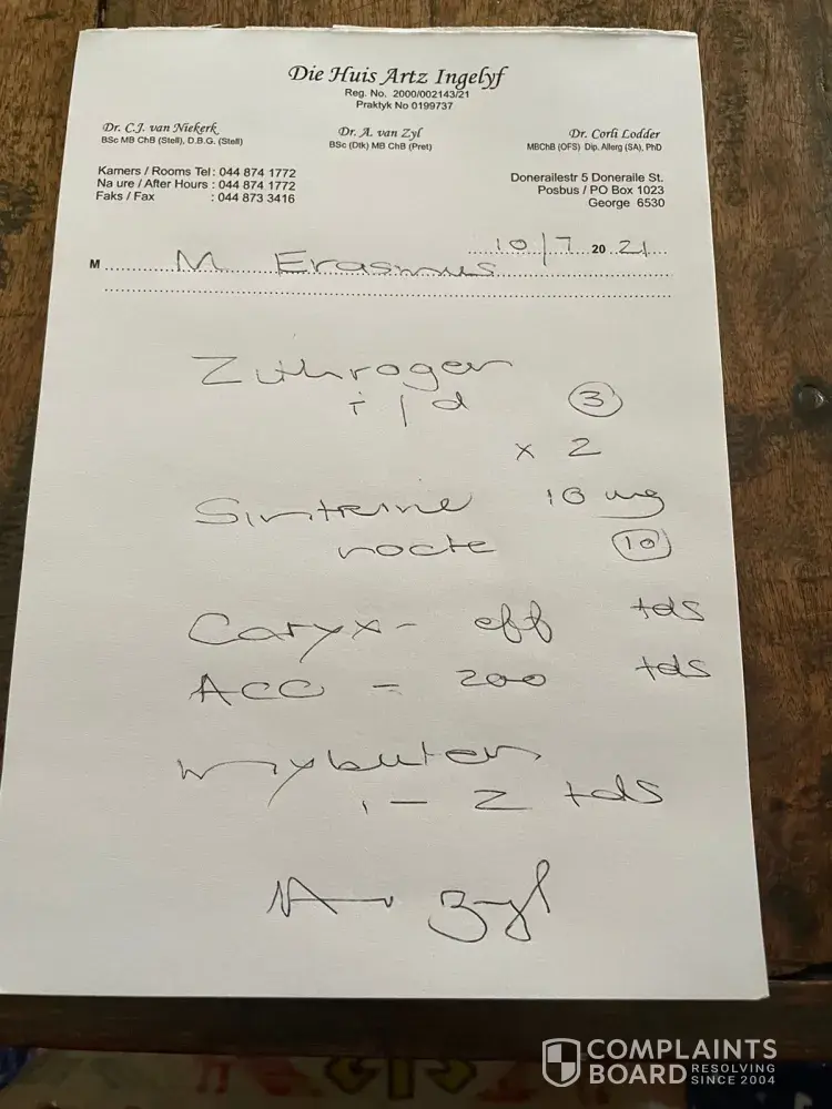 Secondly he prescribed both under the incorrect name ! They where issued to my wife ! I need answers to this and have lodged a formal complaint with the Pharmacy(SA)