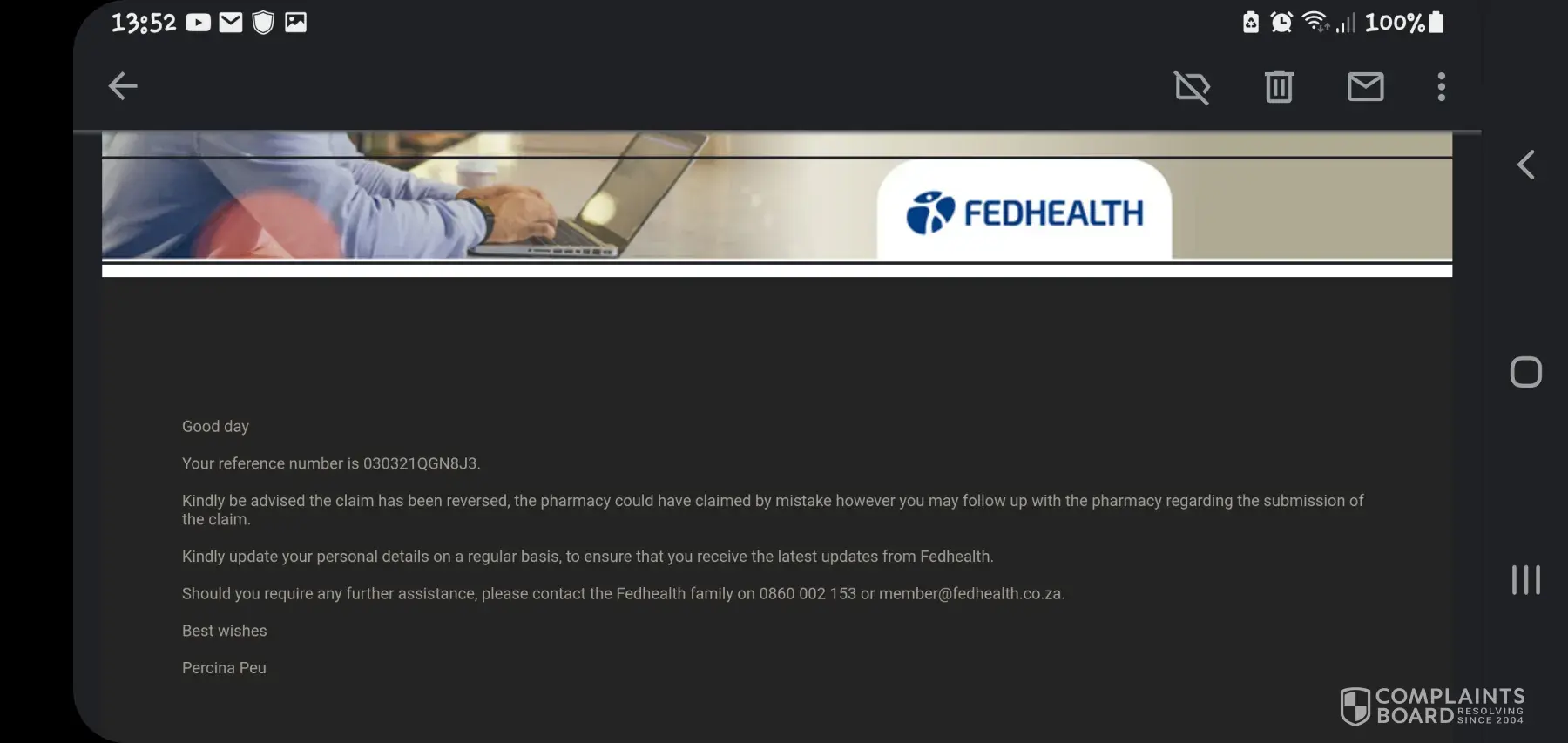 After my complaint of last Friday, Mark from the Walmer Branch contacted me this afternoon with an apology and came to assist my son and myself with our vaccination. I would like to thank Mark for the kind and caring manner he displayed towards us and rectifying the situation. It is reassuring to know that there are still people out there who care.