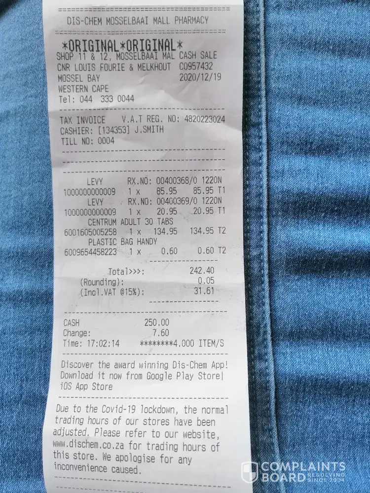 I have a long history and relationship with Dis-Chem going back many years, and normally receive good service from them, especially Dis-Chem Stores in Johannesburg.