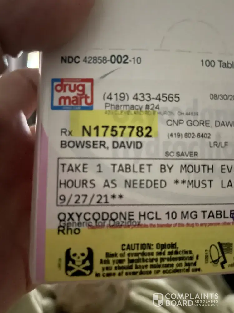 Discount Drug Mart in Brunswick Hills Ohio. My Dr called in an Rx for gabapentin on Monday 8/21-28 days from last refill which I have done many times in the past and my Dr is fully aware of this. This allows for a few extra when I have flare ups of ankylosing spondylitis-a very painful joint condition and spinal stenosis. I weaned myself off oxycodone...