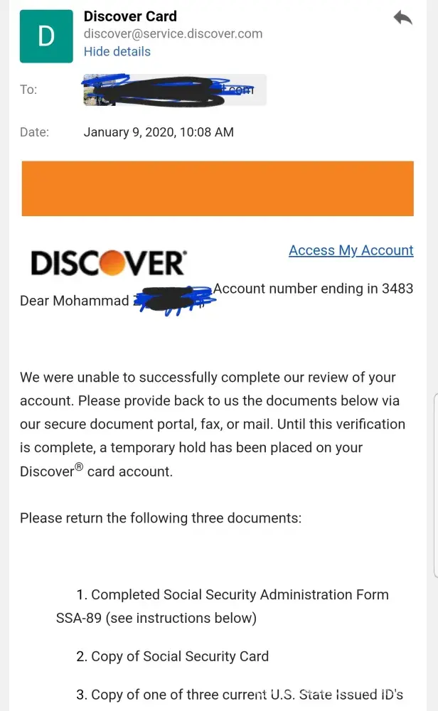 Applied for discover as my first credit card and got approved immediately. Started using it the day I recieved. Within a week they put a hold on my account saying that they need to verify my account. Alright, i did send them the copy of my license, social and a form SSA-89 which needed to be filled and sign. After everything, i just recieved an email today saying that my account has been closed since since they couldn't verify my identity. Are you kidding me? This just destroyed my credit score. Very unreliable.. non professional people. I wish I had listen to everyone that told me not to get this credit card. Never ever going to go back to discover ever.