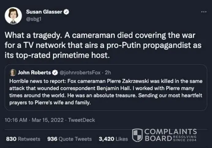 Please read the article enclosed where employee Susan Glasser is mocking the deaths of Fox news personnel in Ukraine.