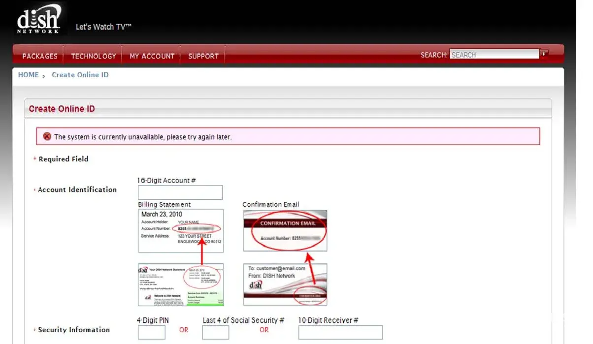 My name is Ray Calo with Dish Network Customer Service. I saw your post and was wondering if you are still having problems with setting up your online account. The error message you mentioned indicates a server problem. If you are still experiencing problems, I would be more than happy to assist you or you can contact our Live Chat @ DishNetwork.com. Click on Support, then Contact Us, and Tech Support Live Chat. My email address is ray.calo@dishnetwork.com.