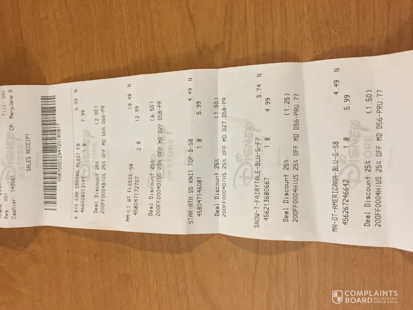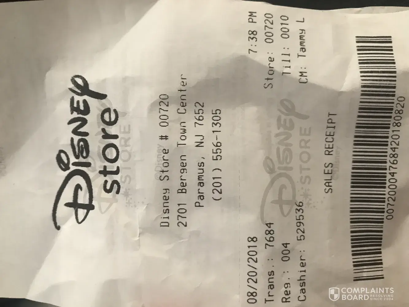 I called the Disney store about a tag that was left on the shirt I purchased . I was then directed to the corporate line . I called them on 08/17/19. I gave them the date of the purchase and the amount . The date was 03/04/19 and the amount was $95.92. this was purchased at the Texas City store, Texas. The said it would be two business days to get a copy of my receipt . we are now 08/28/19 and I have no information. It was not our fault the security tag was left on this shirt . I am upset and want this issue RESLOVED.