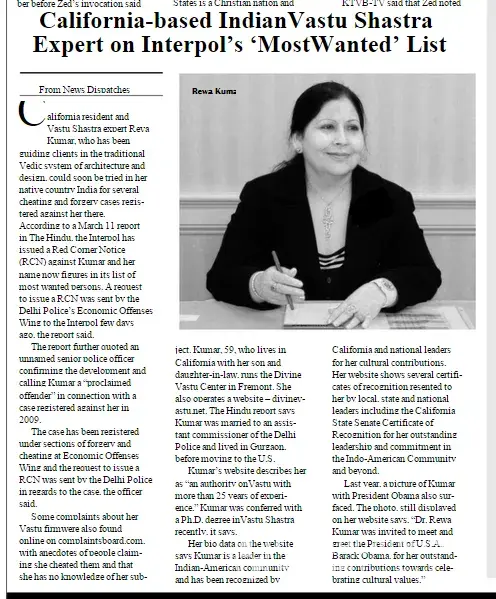 Confirming the development, a senior police officer told The Hindu: “She has been declared a proclaimed offender in connection with a case registered against her in 2009. The case has been registered under sections of forgery and cheating at Economic Offences Wing. In connection with the case, a request to issue RCN was sent by the Delhi Police.†Some complaints about her Vastu firm were also found online, where people claimed that she cheated them of huge amount of money and has no knowledge of her subject. Rewa Kumar is on Interpol’s most wanted list. You can check out the link (http://www.thehindu.com/news/cities/Delhi/indian-vastu-expert-is-on-interpols-most-wanted-list/article6980292.ece).