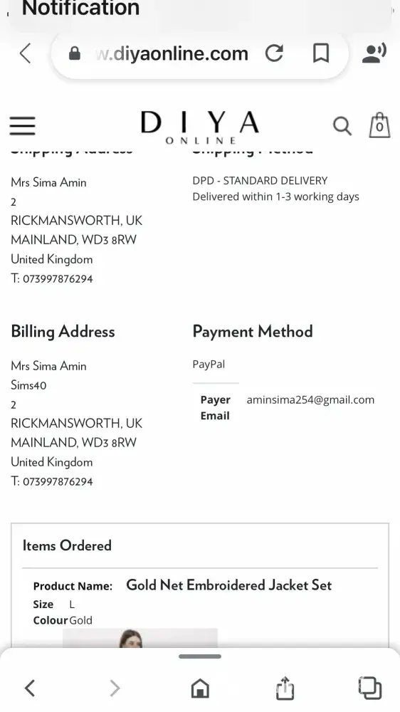 To this day (25/08/2021) I have still not received any message from Diya confirming they received this. I have not received a refund.