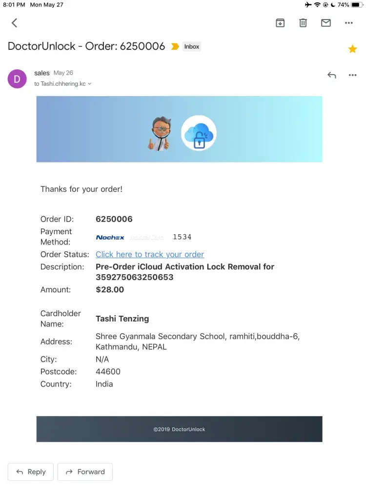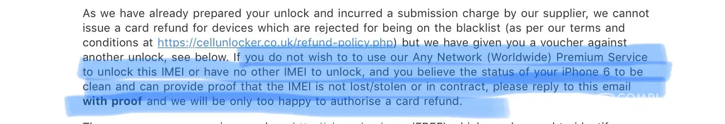 I paid 70$ in two installment first one 28$ and second one 42$ on their service which says that they will unlock my activation lock but instead they took my money and later claim that it can't be unlocked or refunded. Under Statutory Rights & Consumer Rights act 2015 I am in fact entitled to a full refund, irrelevant of any terms and conditions listed on their website. Also they send in a mail which says that if I can prove that my phone is not barred then it can be refunded and I proved that my phone is not barred from one of the website called swappa.com.esp which was mentioned in their website but they won't respond to my mail so I request your assistance in this matter.