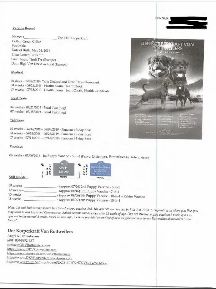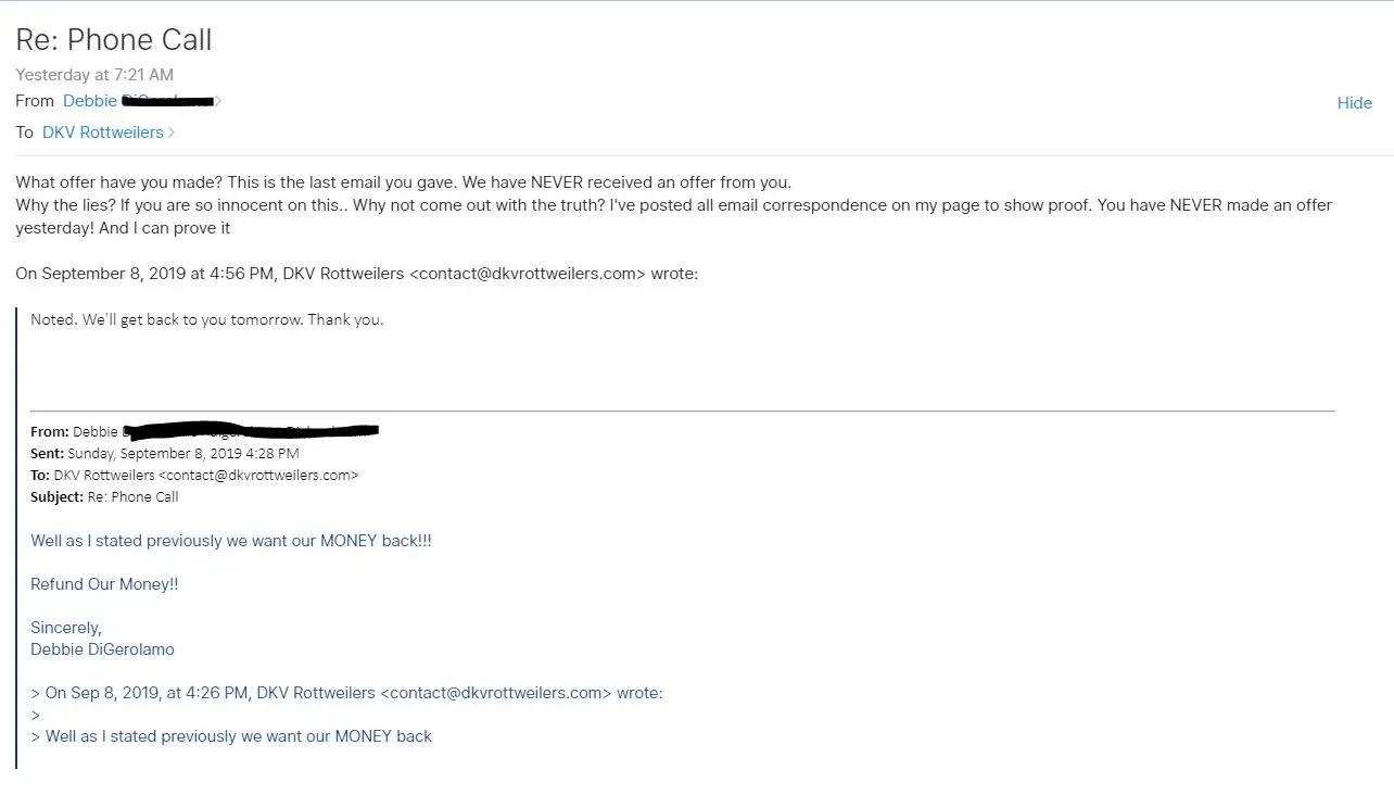 Read full complaintAngel & Liz Gutierrez owners of DKV Rottweiler aka Der Korperkraft Von Rottweilers - dkv sold us a sick puppy and refuse to issue us a refund. they lied, bullied and