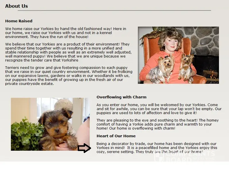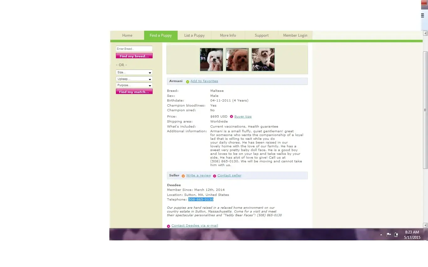 This breeder has done business under multiple names and websites over the last couple of years alone. She adopts out her puppies at 6 weeks, rather than the 8 weeks that is by law. She says that she provides dewormer to her puppies, but it took months to get my puppy dewormed after adoption. The parents of my dog already had another litter together within...