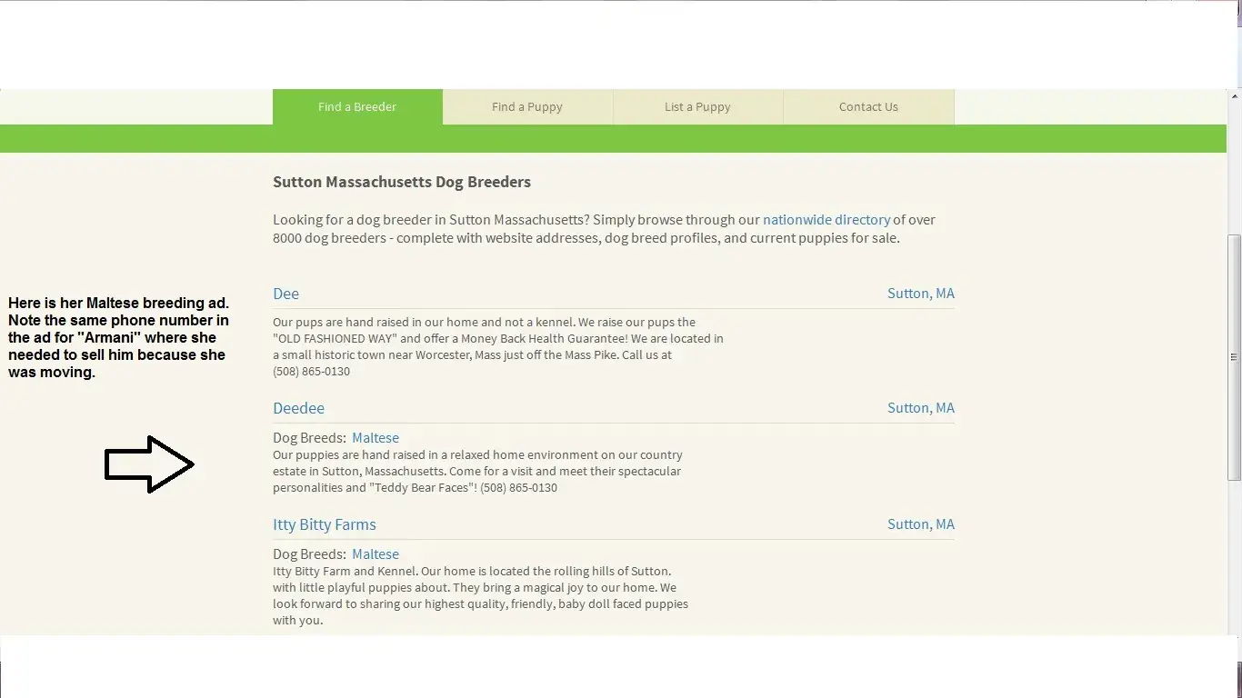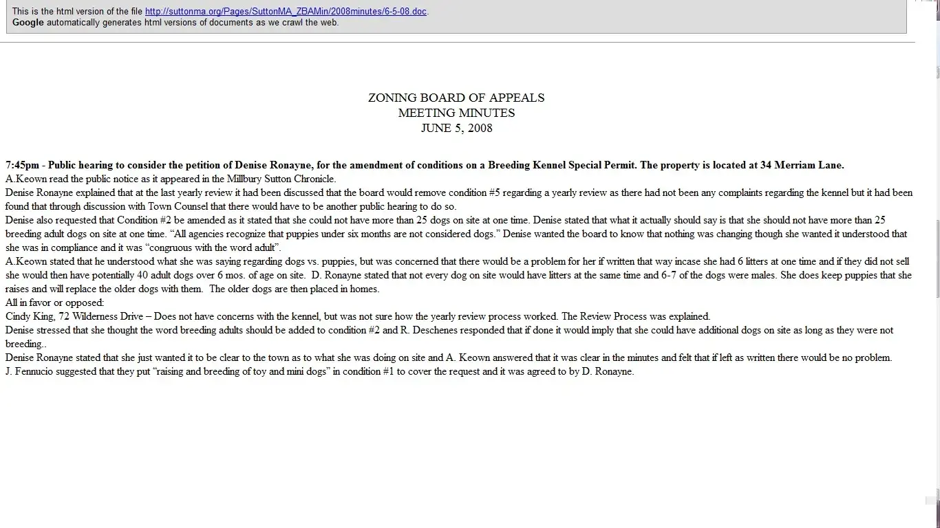 Denise M Ronayne, aka Denise M Lavoie, aka Dee, aka DeeDee, is a breeder who operates her kennel of many breeds in Sutton, Massachusetts She lists her kennel at 34 Merriam Lane in Sutton, MA but the tax assessor does not have a property listed there. Her home is at 38 Merriam Lane with an additional 7 acre lot at 32 Merriam Lane. Please review the attached...