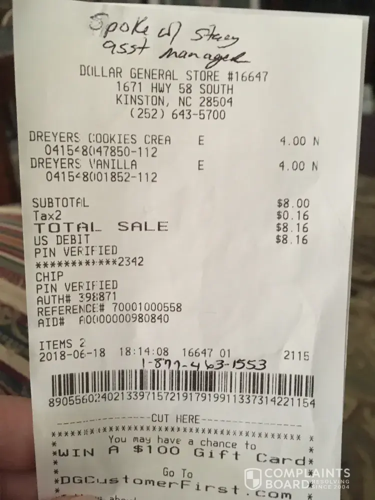 Dollar General store #18847 closing store manager on duty 6/18/2018