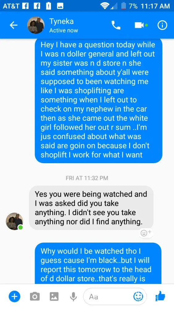 I was shopping in dollar general with my sister and I had looked at kids clothes and picked a. Few outfit to show my sister we were shopping for a baby shower gift. But my sister didn't want to get them so I put back so I go into the bathroom to get tissue and come out and proceed to sit out side on the bench while my sister finished shopping only for my sister to say she heard the manager and another employee tryin to accuse me of shoplifting in which I feel disrespected.i feel the manager is racist because we weren't the only ones in the store but we were the one been watched and then she the white manager proceed to fall us all the way out side like she was pushing carts to see the vehicle we were in