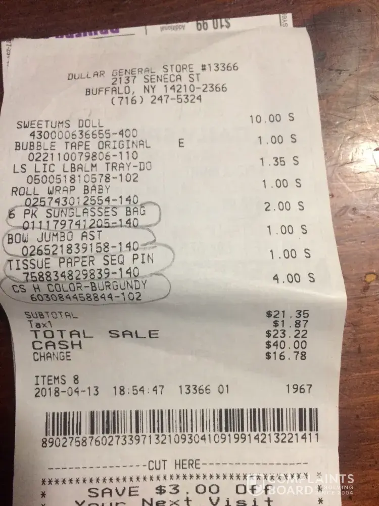I was shopping at dollar general in buffalo ny 14210 Seneca st. I purchased a few items & did not leave the store with them items . I called right away n spoke to cashier not sure of name then a girl name Sam stated she was a manager & that I can come back with receipt n she will check cameras ... so I drove all the way back a 20 min drive braught my receipt circled items I didn't receive she then took it and went in back came back 15 seconds later n said I walked out with my 2 bags ... I have receipt & she sat there yelling at me in front of 5 other people walking up into the back of line ... she is rude, ignorant, & shouldn't be speaking to her customers like that I was not rude nor yelling I was polite ... I paid for the merchandise I didn't get & I just want my money back or my items ... they are very unprofessional in that store only 1 register 1 cashier line out around the store ... will never go back & I will not recommend to anyone ...