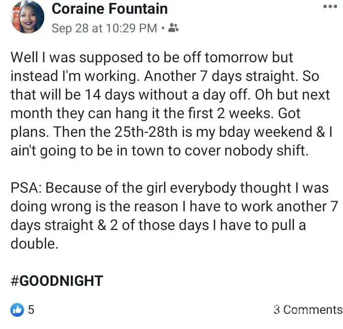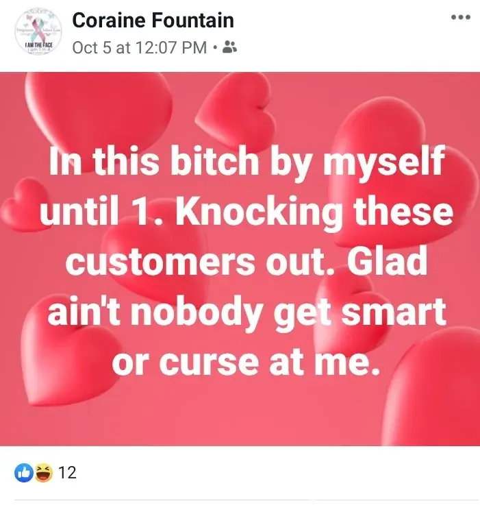 If you are going to be a manager...you might not want to lose your workers because you are selfish. I was told by her that she is willing to work with me while I am dealing with issues with my children and apparently helping me is terminating me. I was hired August 1st of 2019, and as of October 14th of 2019 I just today recieved verification that I am no longer employed by her store. There are lots of issues with her with numerous individuals and she shouldn't be allowed to treat her employees the way she does.
